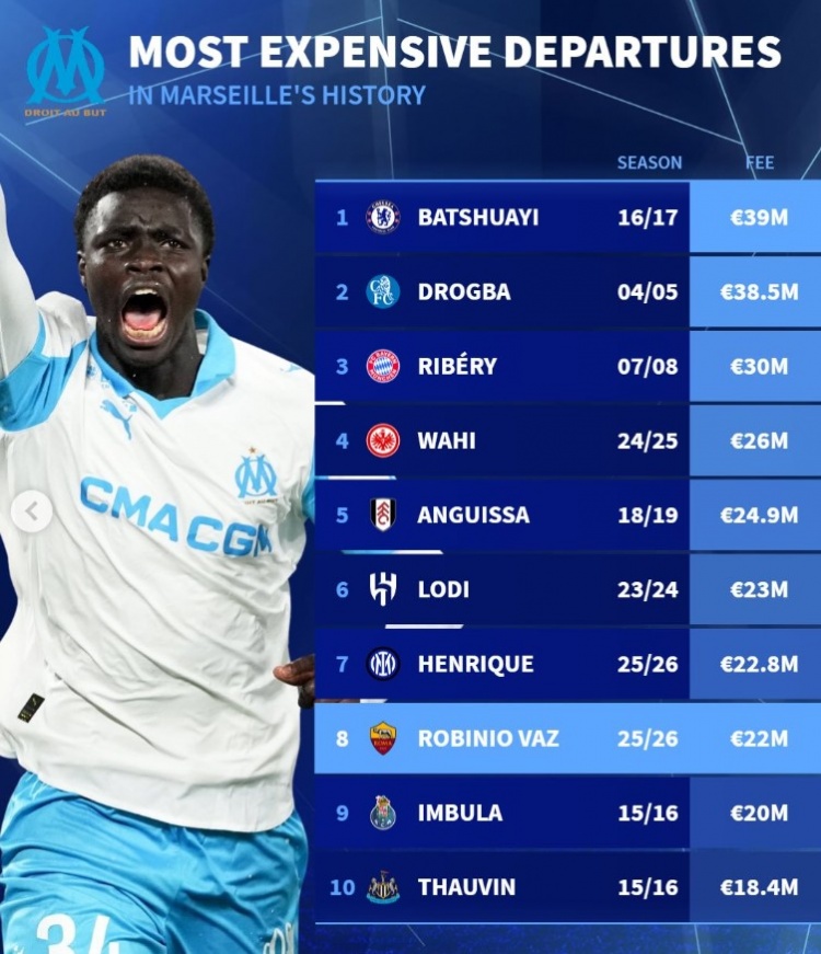 直播吧1月15日讯罗马已经官宣引进马赛18岁中锋瓦斯,《转会市场》也统计了马赛队史最贵转出情况,巴舒亚伊居首。