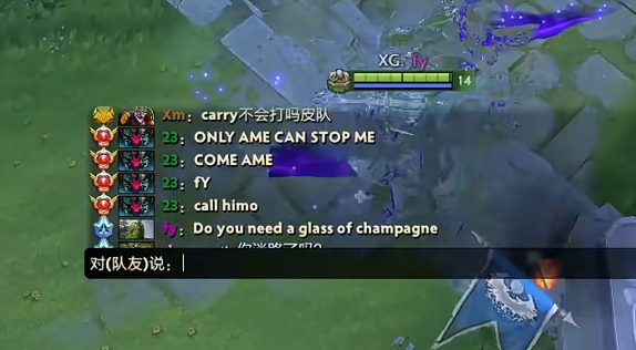 最近的一把东南亚天梯,森哥所在的天辉被23虐了,23公频打字跟Fy说"只有Ame能干我,你赶紧叫Ame来一起排",没想到森哥转头回了个"哥们你是否需要开一瓶香槟",引得众人哈哈大笑,不愧为冷面笑匠