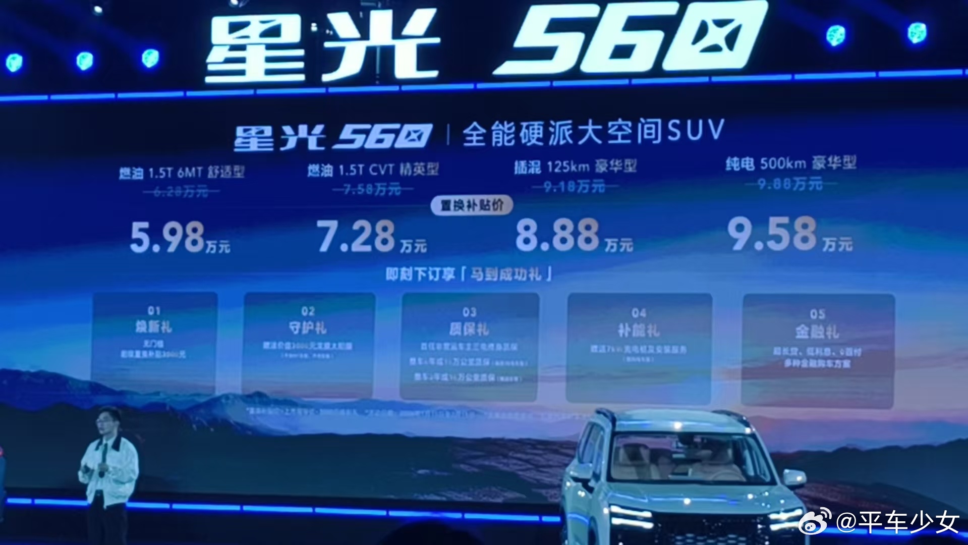 星光560这次在海口开发布会,海风配新车太惬意了~四款车型价格:首发5.98万起!燃油1.5T手动挡5.98万,燃油自动挡7.38万,插混版8.98万,纯电版9.88万,10万内直接拿下中型SUV,还有很多权益,甚至支持0首付!性价比这块还得是五菱!