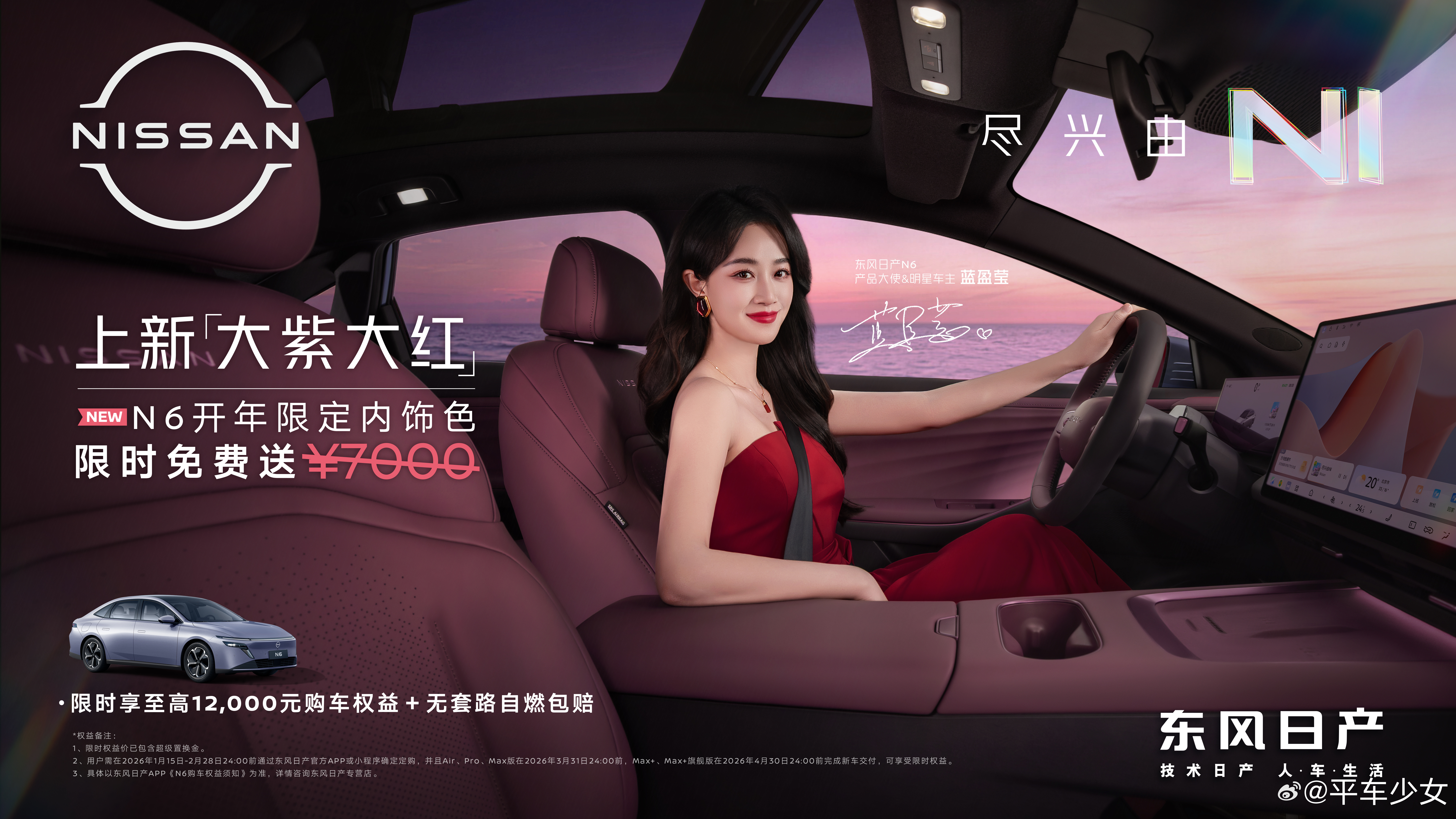 和蓝盈莹一起解锁东风日产N6「大紫大红」新内饰,把开年的鸿运直接拿捏了,颜值、舒适、续航一个都不能少,这才是真·大红大紫!新内饰选装价本来要7000,现在也限时免费送,跟新年太适配了!蓝盈莹开N6红运当头新年开大紫大红大N6东风日产N6