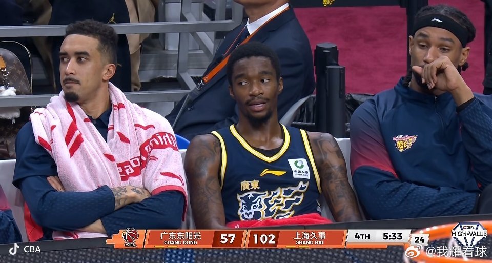 广东队落后50分了,也算见证历史了哈哈哈杜锋指导派上全华班了,场下三位外援神情落