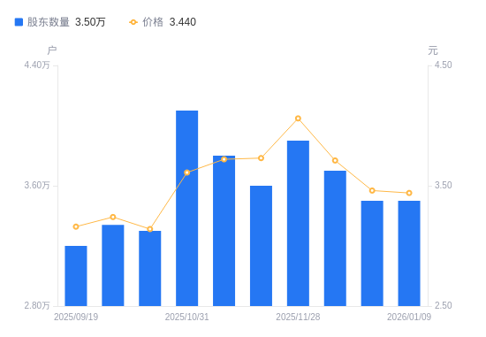 日期A股户数(户)流通A股户均持股数(股)户均持股市值(万元)2026-01-093500030660.7110.552025-12-193500030660.7110.612025-12-103700029003.3710.762025-11-283900027516.0211.172025-11-203600029809.0211.122025-11-103800028240.1310.512025-10-314100026173.789.452025-10-203300032518.9310.212025-09-303340232127.5610.412025-09-193200033535.1510.60
