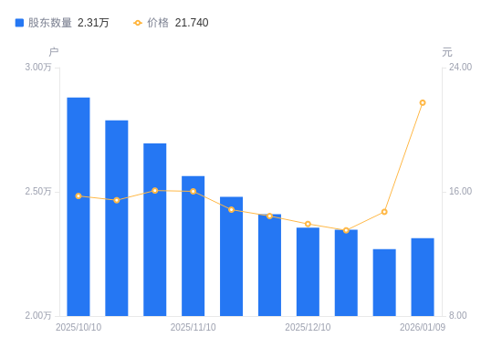 日期A股户数(户)流通A股户均持股数(股)户均持股市值(万元)2026-01-092313610419.1622.652025-12-312269010623.9615.632025-12-192347810267.3813.882025-12-102355410234.2514.262025-11-282410210001.5614.442025-11-20247969721.6314.442025-11-10256339404.1915.072025-10-31269508944.6214.382025-10-20278768647.5013.372025-10-10287968371.2213.17