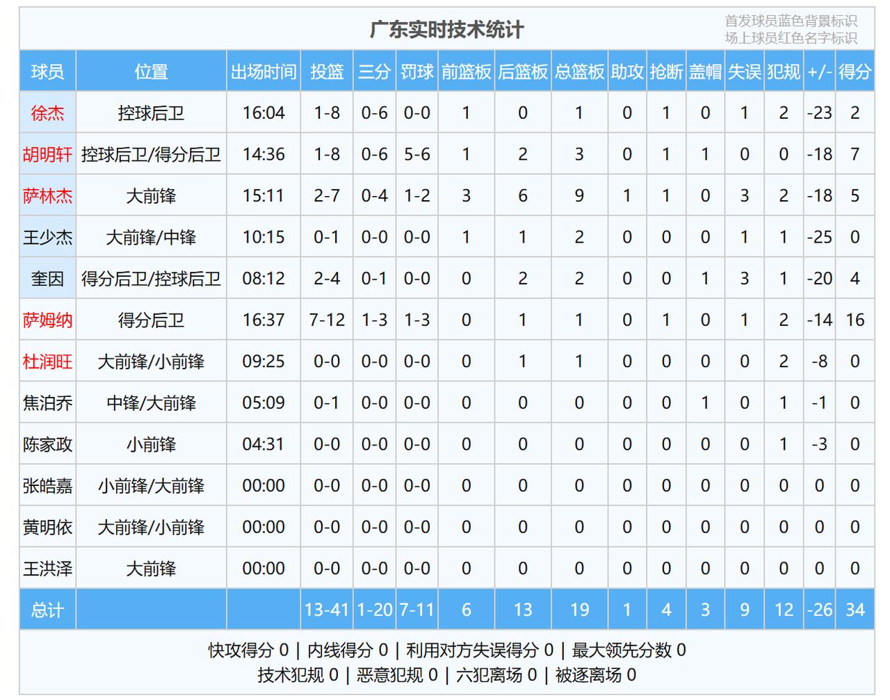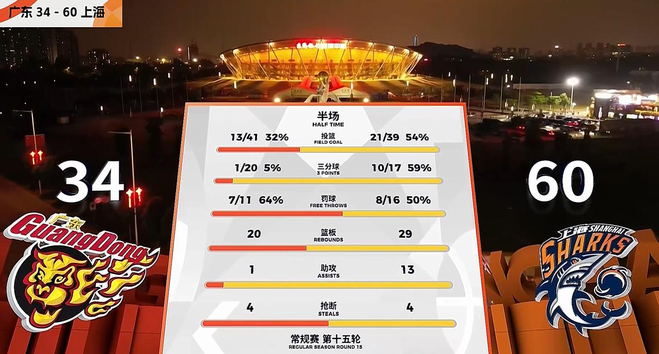 不可思议!广东队三分球20中1,半场输上海26分 杜锋暴跳如雷 CBA常规第十五轮,迎来了一场焦点比赛,广东队坐镇主场PK上海队。在赛前,上海队主教练卢伟就放话,球队大外援洛夫顿背部有伤,将会不参加这场比赛。在这样的情况下,很多人都认为,广东队拿下比赛胜利,并不会有太多难度,会轻拿捏! 然而,理想很美好,现实很残酷!首先,卢伟说洛夫顿会休息,就是一个迷惑广东队的计谋,本场比赛,洛夫顿依然出现在12人大名单之中,并且登场亮相。其次,广东队在比赛中,打得不知所谓,全队在梦游,开局就被上海队打了26-6的攻击波,早早就落后20分,让人大跌眼镜。 目前,双方上半场比赛已经结束,广东队以34-60落后上海队26分。这样的一个分数,在10分钟一节的比赛,可以说,广东队想要逆转,几乎是不可能的事情。本场比赛,广东队就是输多少分的问题,是20分,还是30分,或是40分…… 从上半场广东队的表现来看,可以说,有很多地方让人看不懂,比如,胡明轩空篮不中,罚球也不得分,三分球6投0中。比如,徐杰三分球6投0中。比如,萨林杰三分球4投0中,上半场比赛,广东队三分球20次出手,只命中了1球,命中率只有5%,这样的水平,比业余水平还差吧,真的是不可思议。反观,上海队17投10中,三分球命中率,超过了五成。双方命中率相差如此之大,上海队领先26分,似乎也是合情合理。 看到广东队球员不是打铁,就是在打铁的过程中,而且, 还不断出现低级失误,广东队主教练杜锋, 也是十分愤怒,十分生气,在场边,不断发脾气,不断暴跳如雷…… 然而,不管杜锋如何生气,如何发火,但是,广东队球员的球员依然是十分低迷,依然是找不到北,分不清方向…… 开局打6-26,三分球20中1,半场输对手26分,毫无疑问,这场比赛,对于主场作战的广东队来讲,是一场耻辱性的比赛。