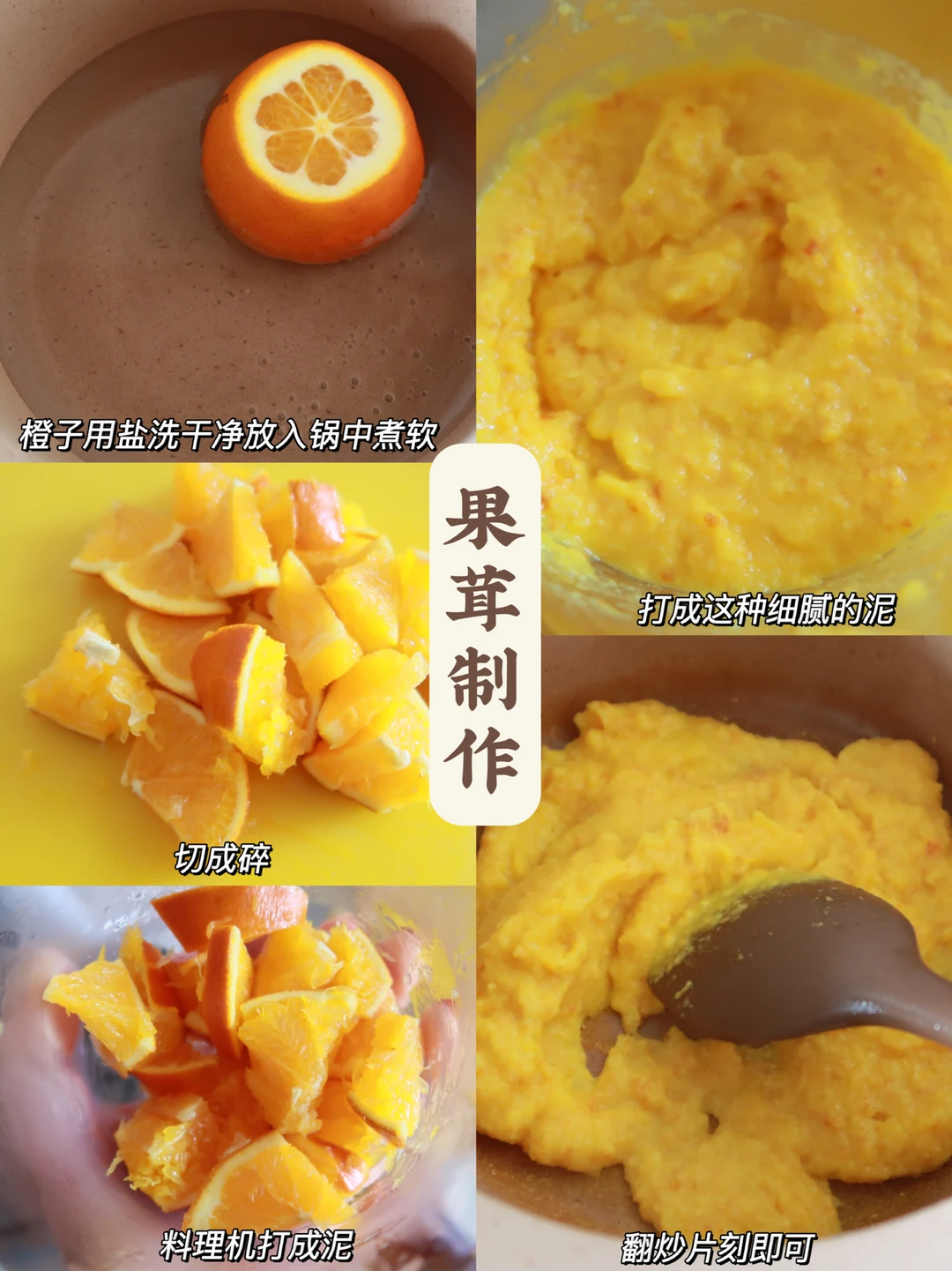 ✔️果茸制作:橙子洗干净用水煮软,料理机打成泥,然后小火翻炒出锅即可