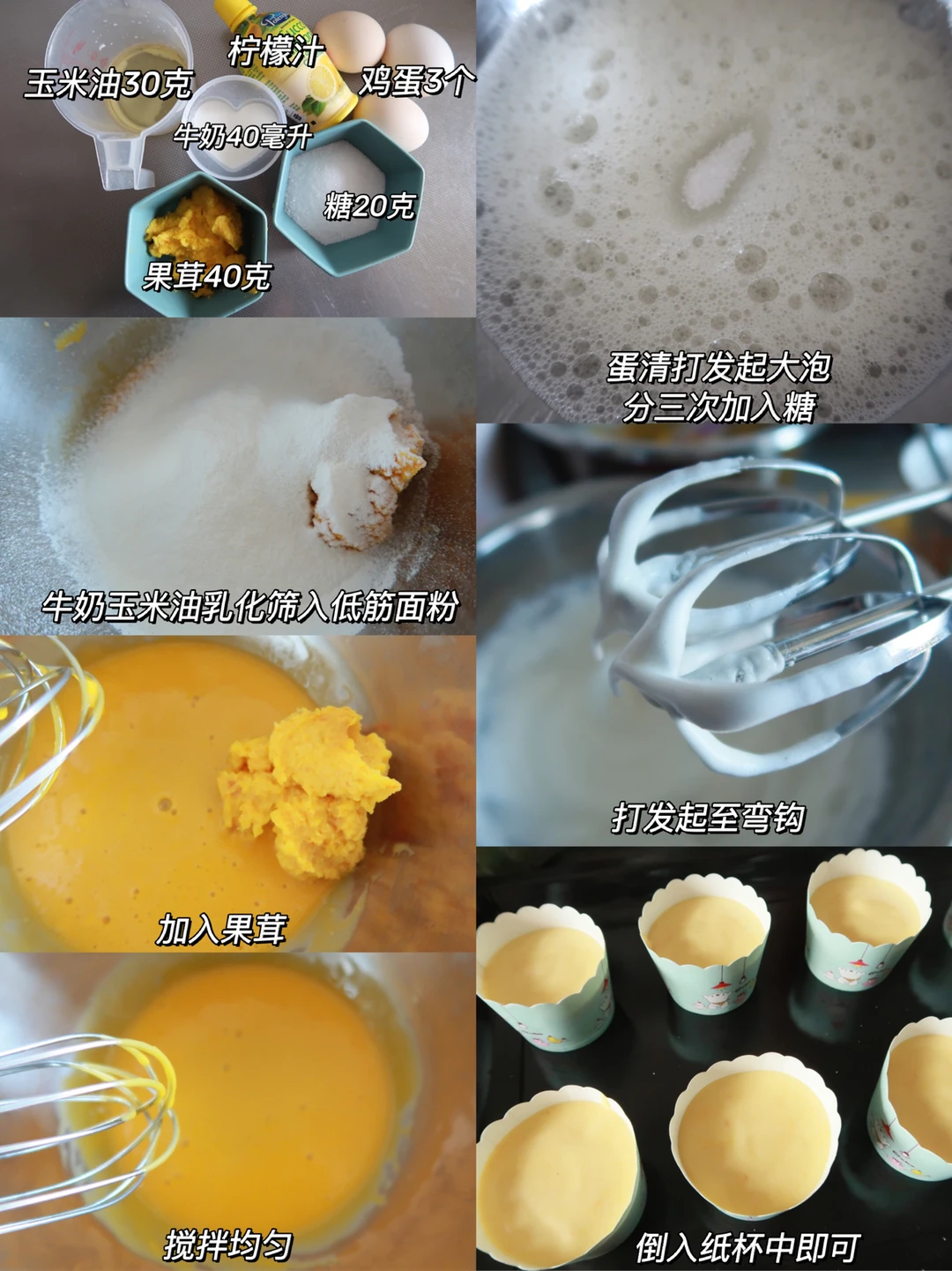 2、一定要筛入面粉不然容易起块,果茸不要一次倒太多,分次加入,不然太粘稠,记得蛋黄糊是流动才行
