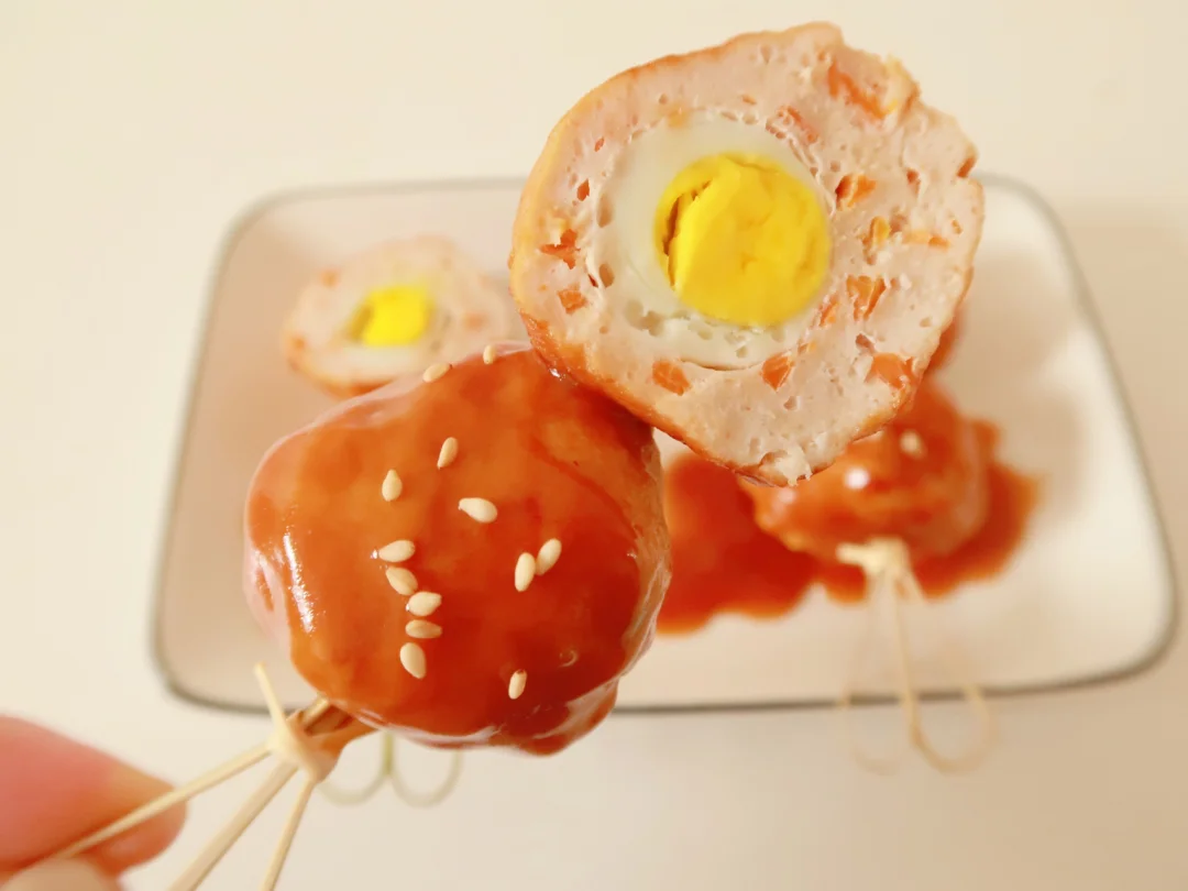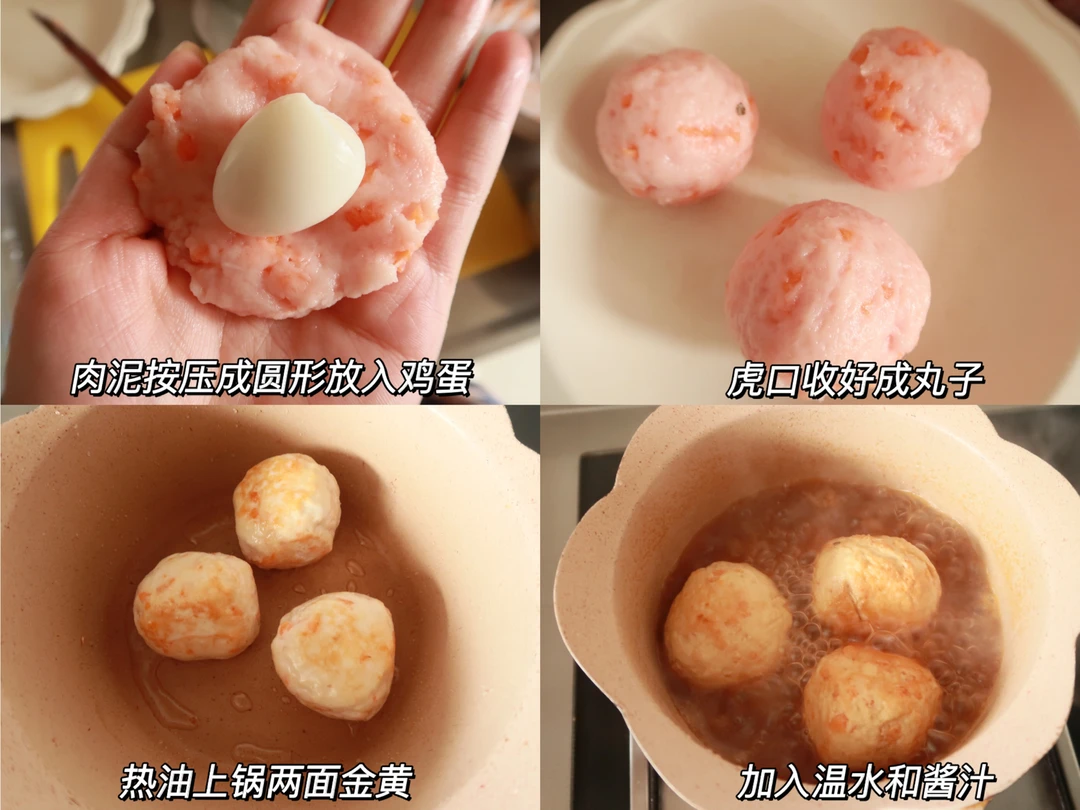 🔸步骤:胡萝卜切丁末备用,鹌鹑蛋煮熟备用,里脊肉加入玉米淀粉蛋清打成泥,加入胡萝卜丁搅拌均匀,肉泥按压成饼放入煮熟的蛋然后虎口包起来,热油上锅煎至两面金黄放入一碗温水,两勺宝宝酱油,一勺番茄酱(我之前是直接把肉丸放入冷水开始煮感觉也很不错),大火煮开转中小火15~20分钟,起锅前5分钟放入水淀粉勾芡收汁即可