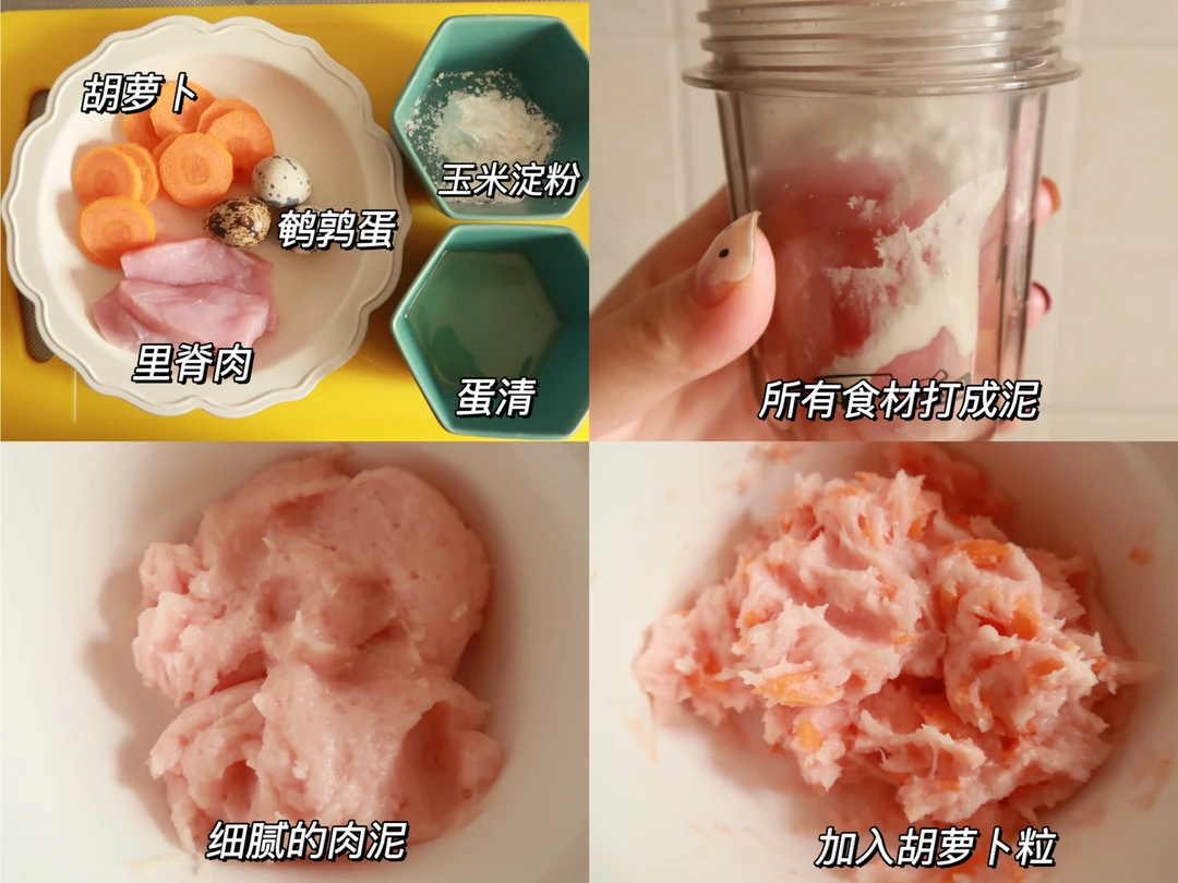🔸材料:胡萝卜、鹌鹑蛋、玉米淀粉、蛋清,里脊肉还可以加了藕片感觉更好口感