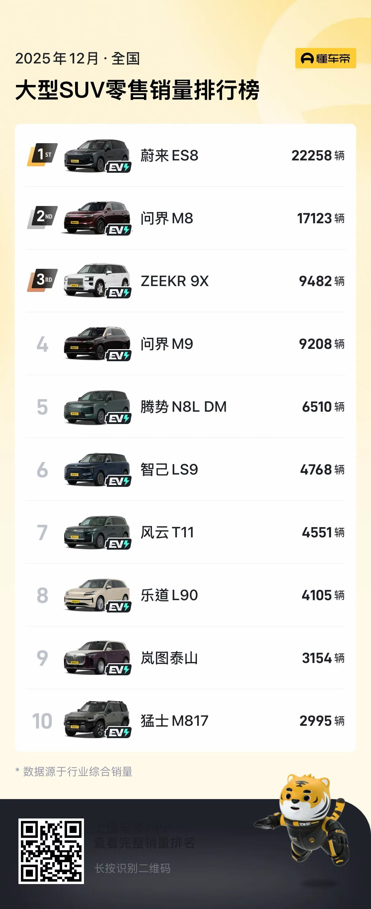 12 月,ES8 拿下 40 万以上销冠。原因很简单,因为在 12 月的 40–45 万区间,有一个真空带,目前蔚来是跟理想,问界,BBA 抢用户。L9 已经不是“新车”,换代一直没有大更新,产品力越来越弱。问界 M9 已经朝着 50+上去了,M8 品牌与产品力也打不过。BBA 在清库存,不在放量。蔚来 ES8 大六座,纯电加换电,再加上今年这个价格。在这个价格带里,ES8 太有竞争力了。
