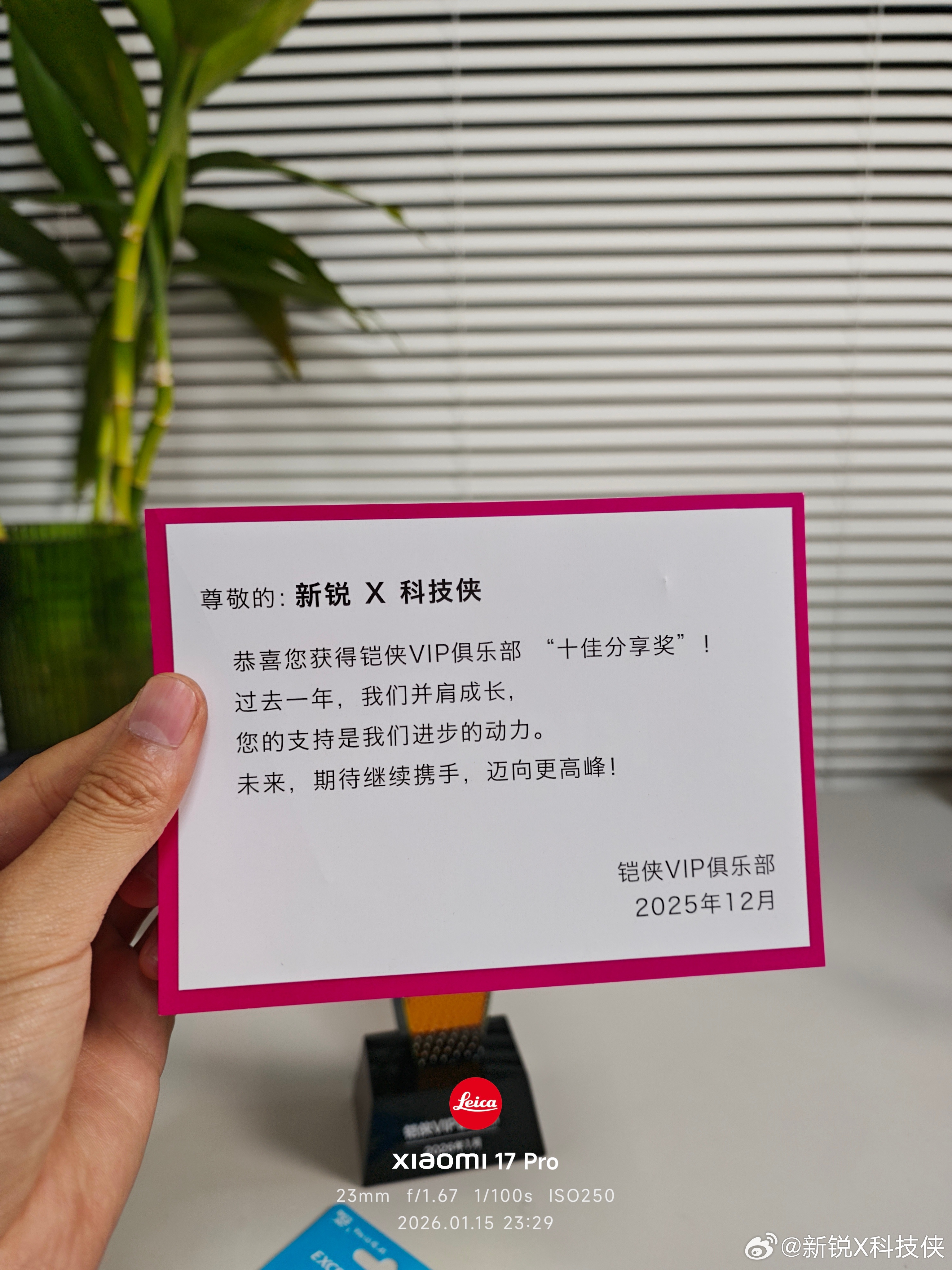 非常开心获得了铠侠VIP俱乐部2025年度十佳分享奖,今天我收到了这个沉淀的的奖牌非常开心非常有仪式感,过去的一年里有幸见证体验了铠侠的很多优秀的产品,性能强而且性价比高,作为喜欢装机的年轻人我现在非常认准铠侠。希望未来铠侠的产品越来越给力,我也可以继续贡献好的体验作品和各位网友一起体验优秀的产品。
