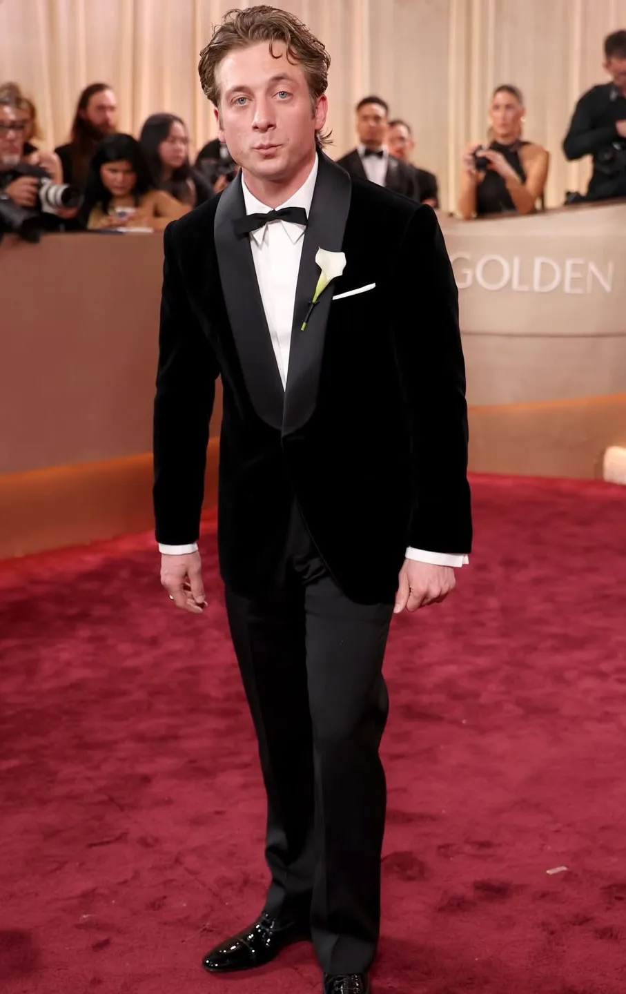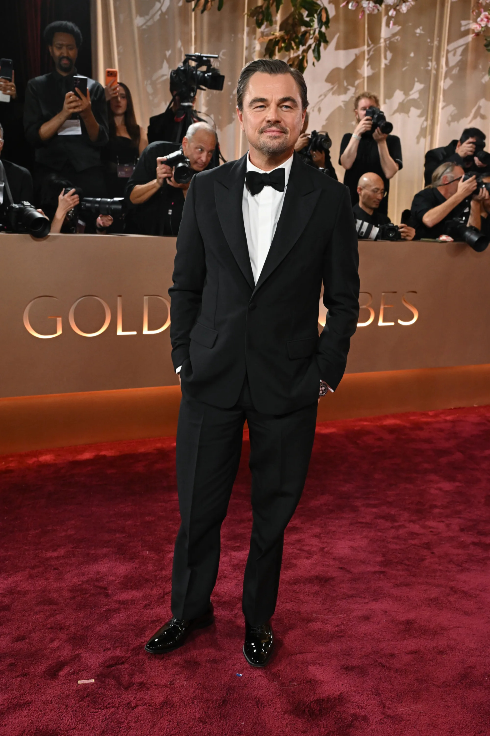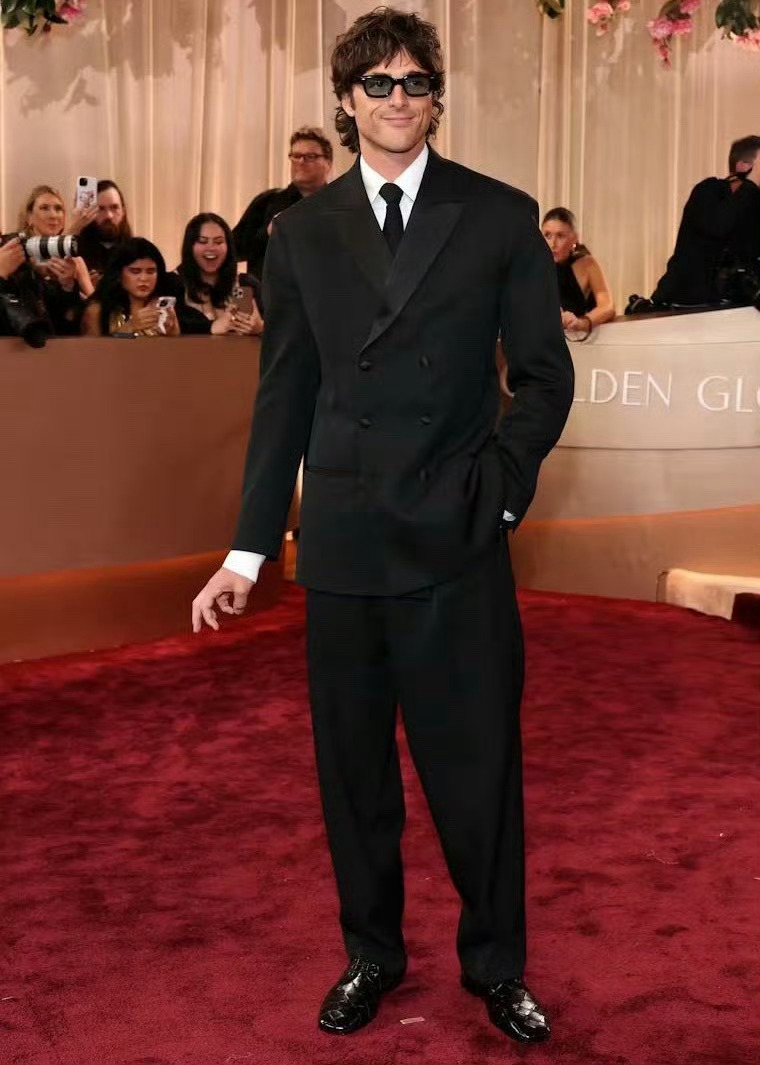时尚灵感解读 这一届金球奖,男星们不约而同地回到了黑色西装和燕尾服。没有抢眼的色彩博弈,也没有过度用力的造型表达,反而是一种对经典的重新确认——用剪裁、质感和分寸感,把红毯穿得很“对”。剪裁,比颜色更重要今年的黑色不再只是保险牌,而是一道关于比例的考题。肩线是否干净,腰身是否利落,裤脚是否克制,都会直接影响整体气场。谁的剪裁更准,谁就更容易被记住。材质和细节,决定好不好看丝绒的低调光泽或一枚胸针,让黑色多出层次和温度。这些细节本身并不张扬,但在镜头里会被自然放大,成为真正的加分项。黑白对比,依然可靠燕尾服配白衬衫,依旧是红毯上最稳妥的选择。在足够简洁的前提下,黑与白的对比反而显得从容、有分量。Connor Storrie in Saint Laurent 西装,佩戴Tiffany & Co. 经典Schlumberger 胸针,浓浓摩登感。Jeremy AllenWhite in Louis Vuitton 胸前佩戴一朵花,点亮整体。Leonardo DiCaprio in DiorTimothée Chalamet in Chrome HeartsJacob Elordi In Bottega Veneta.金球奖红毯金球奖