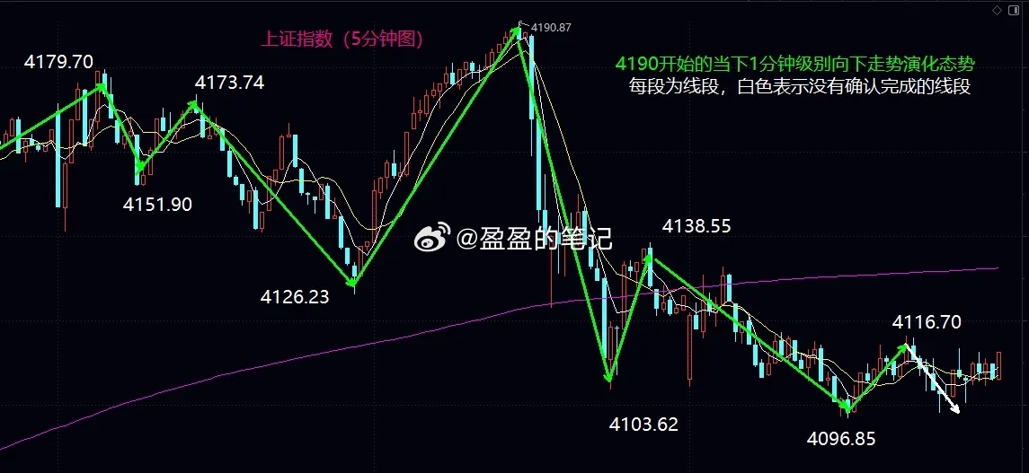 大盘初步走出以空间换时间的预期震荡演化,月底前是相对舒适的波段操作窗口期大盘今天演化的非常好,不仅跌破4100关口使得前后两个1分钟级别波动中枢重叠导致扩展,而且全天高效率的走出上下上下4根新线段,尾盘差一点走出第5根线段。这样一来,大盘就基本进入了按照本人预期的有利于中枢演化的通过横盘震荡来整固4100关口的预期。不出意外,本月底之前有望通过震荡构造出3815以来的第一个5分钟级别震荡中枢,为春节前后再次向上突破奠定技术基础。中枢结构上,由于今日扩展,所以昨天高点下来就是一个没有确认走完的1分钟级别向下走势,该向下走势的第一个反弹中枢今天也已经构造完毕,中枢区间(4103-4116),这样,短线在4100关口站稳,大盘又随时可以切换为向上方向的1分钟级别走势。总之,大盘今天开始大概率进入4100-4200之间构造5分钟级别中枢的平稳震荡过程,个股自然也将按照预期轮流活跃,而这自然是喜欢短线操作者的绝佳波段实践窗口。