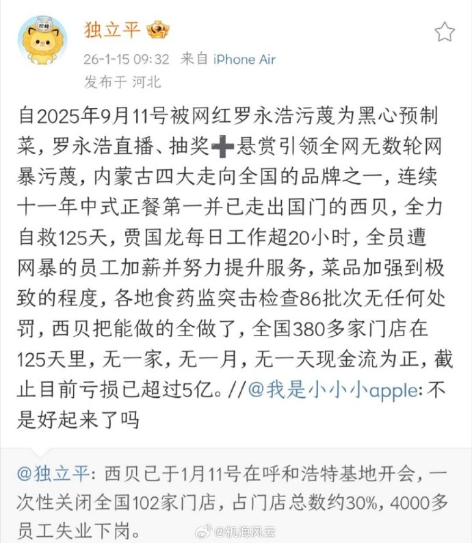 西贝将关闭102家门店,贾国龙朋友圈称尽力了,而网友喊话罗永浩负责…个人感觉,西贝这次预制菜风波,是一次典型的公关灾难案例。罗永浩最开始只是说了句东西难吃,贾国龙的应对太过应激了,导致双方你来我往在舆论场上“火拼”,最后谁是受伤最重的那一方很明显了。我想西贝这么大的企业,应该是有应对舆论的预案的,但是不知道为什么一直是老板冲在前面。而且我感觉从头到尾老板也没弄清该事件的民意旋涡在哪里,他的论调像是一直在喊冤…西贝将关闭102家门店胡锡进称西贝事件是一个悲剧热点观点