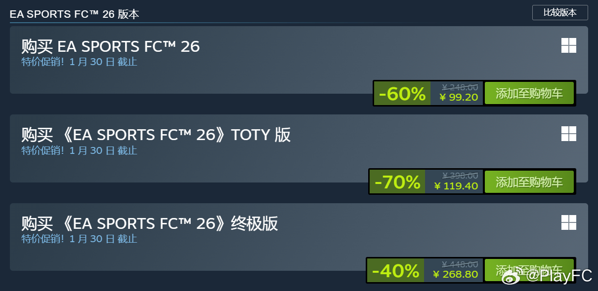 FC 26 TOTY版本目前已经推出。包含内容见下图。PlayStation平台售价:189港币Steam国区售价:119元FC26