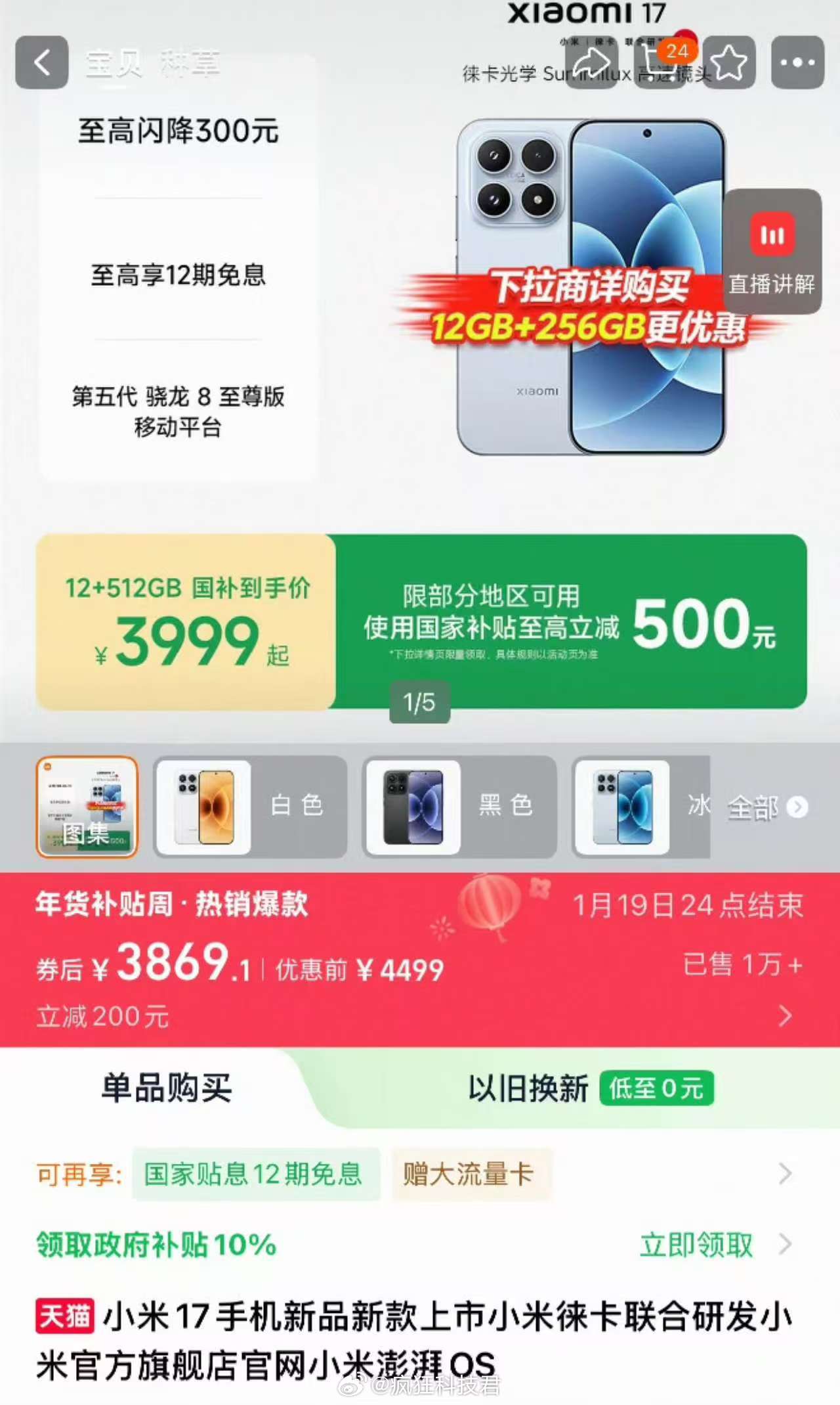 小米17官宣降价本来官方说至高闪降300块,我还寻思就是常规操作,结果一算叠加补贴直接能减900,12GB+256GB版本最低3599就能拿下,还能享12期免息,月供才三百多,这压力跟没有一样。更绝的是以旧换新,旧手机要是能评到4000块,直接补贴1400,我翻了翻家里的旧机,感觉能直接当“大额抵扣券”用,折上折下来简直香到骨子里。我反正已经心动了,准备把旧手机拿去以旧换新,趁这波优惠直接冲,错过估计得拍断大腿!