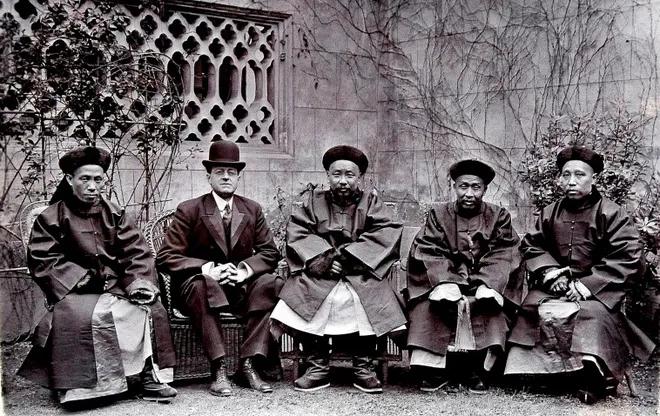 1909年,湖南巡抚衙门的庭院里的一张中外人士合影,那个外国人是美国学者兼旅行家盖洛身着西式西装、头戴礼帽,居中的中国官员是当时的湖南巡抚岑春蓂,其余为湖南地方官员。