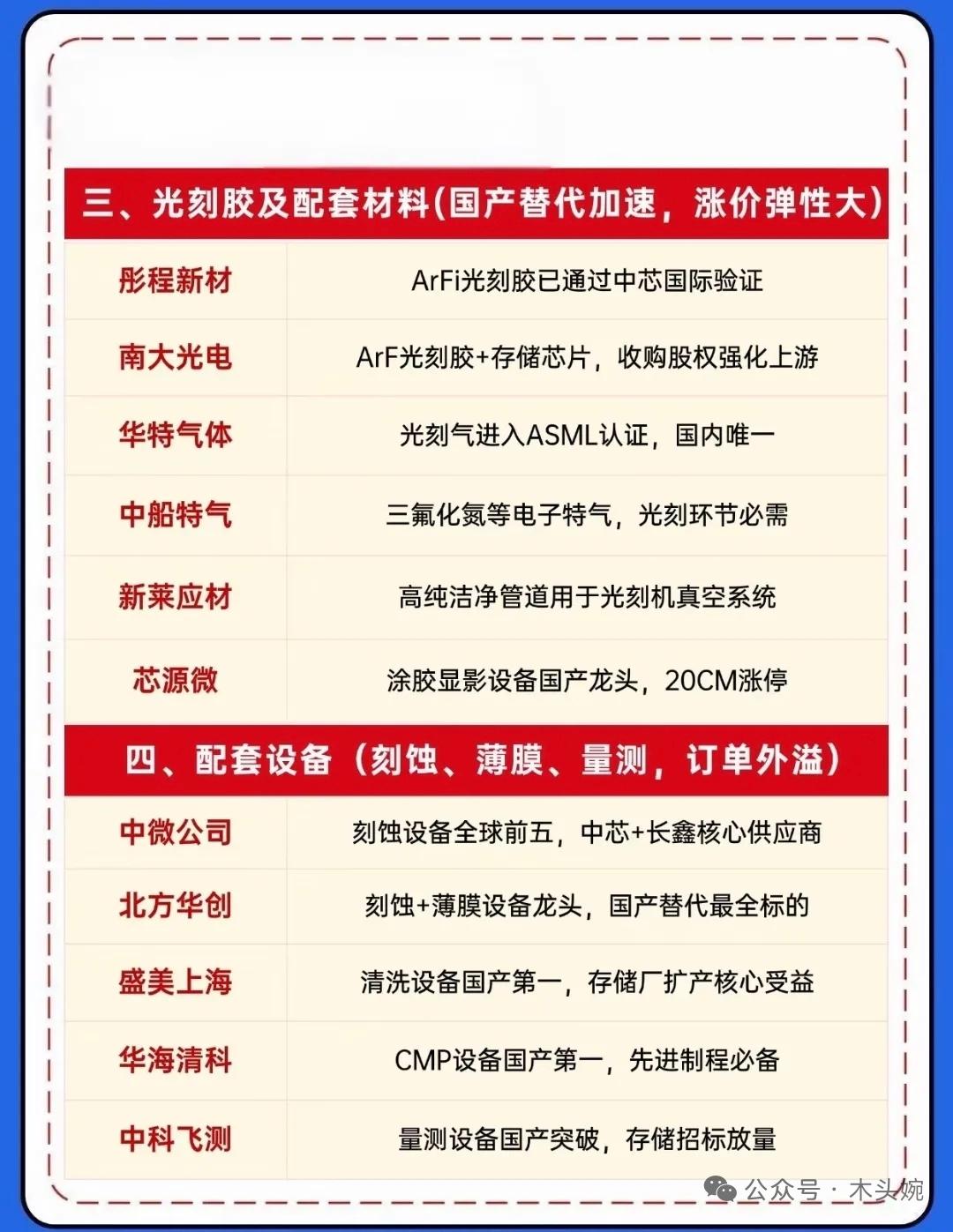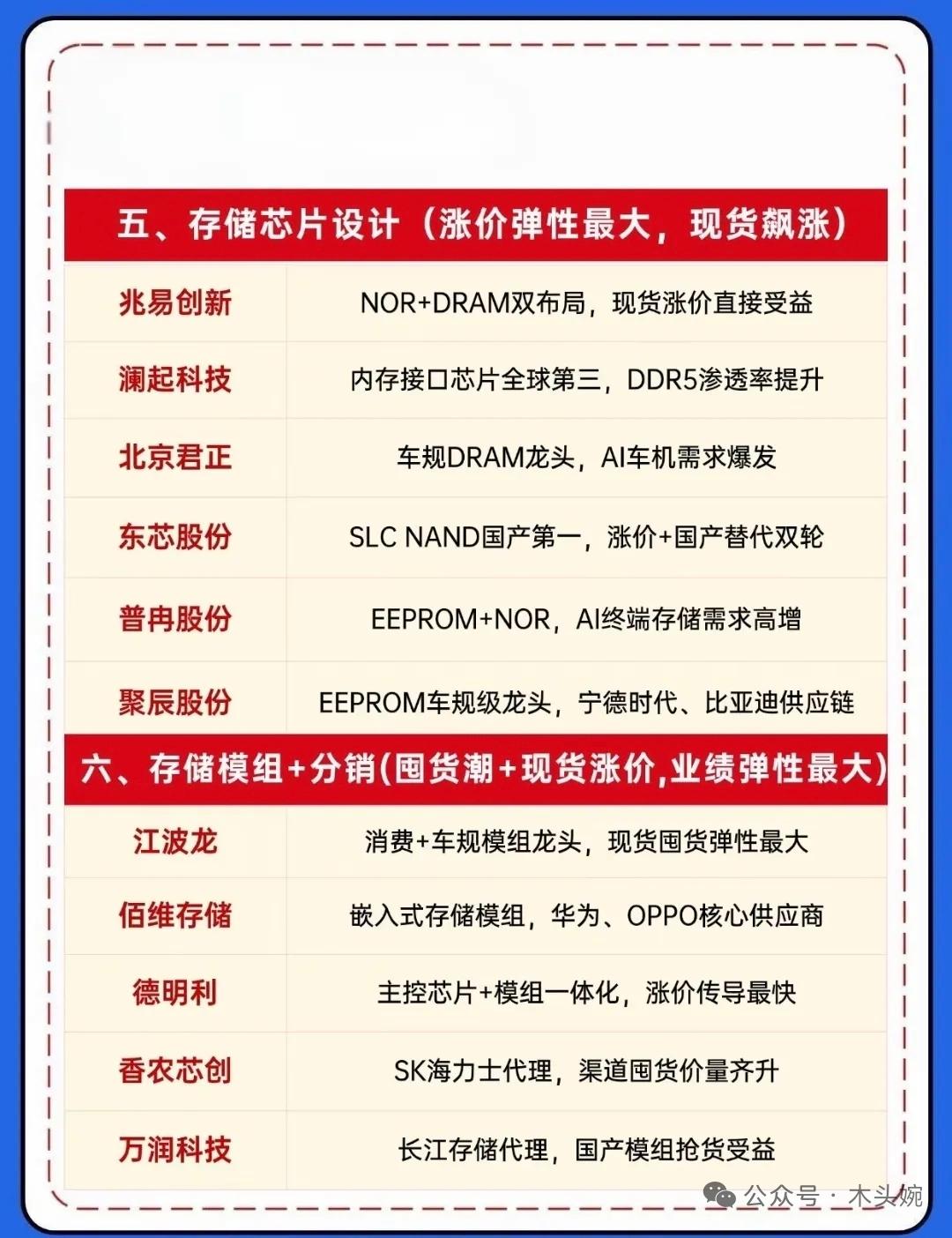 AI算力需求爆发,存储芯片进入超级牛市,价格持续大涨,HBM/服务器DRAM为核心受益方向;国内企业加速扩产与技术升级,封测环节同步受益,相关概念龙头企业有哪些? 存储芯片持续涨价的风口下,半导体产业链核心标的全梳理来了!从光刻机整机研发的张江高科、苏大维格,到EUV上游核心部件的炬光科技、波长光电,再到光刻胶及配套材料的彤程新材、南大光电,还有刻蚀设备龙头中微公司、北方华创,以及存储芯片设计的兆易创新、北京君正,存储模组分销的江波龙、佰维存储等企业,覆盖光刻机、材料、设备、存储设计与模组全链条,每家都凭借技术壁垒或市场地位占据赛道关键位置,成为存储涨价潮中的核心受益方。 投资有风险,决策需谨慎。建议投资者聚焦技术壁垒稳固、业绩兑现能力强的龙头标的,密切跟踪存储价格走势、产能利用率及政策变化,合理控制仓位,避免盲目追高。