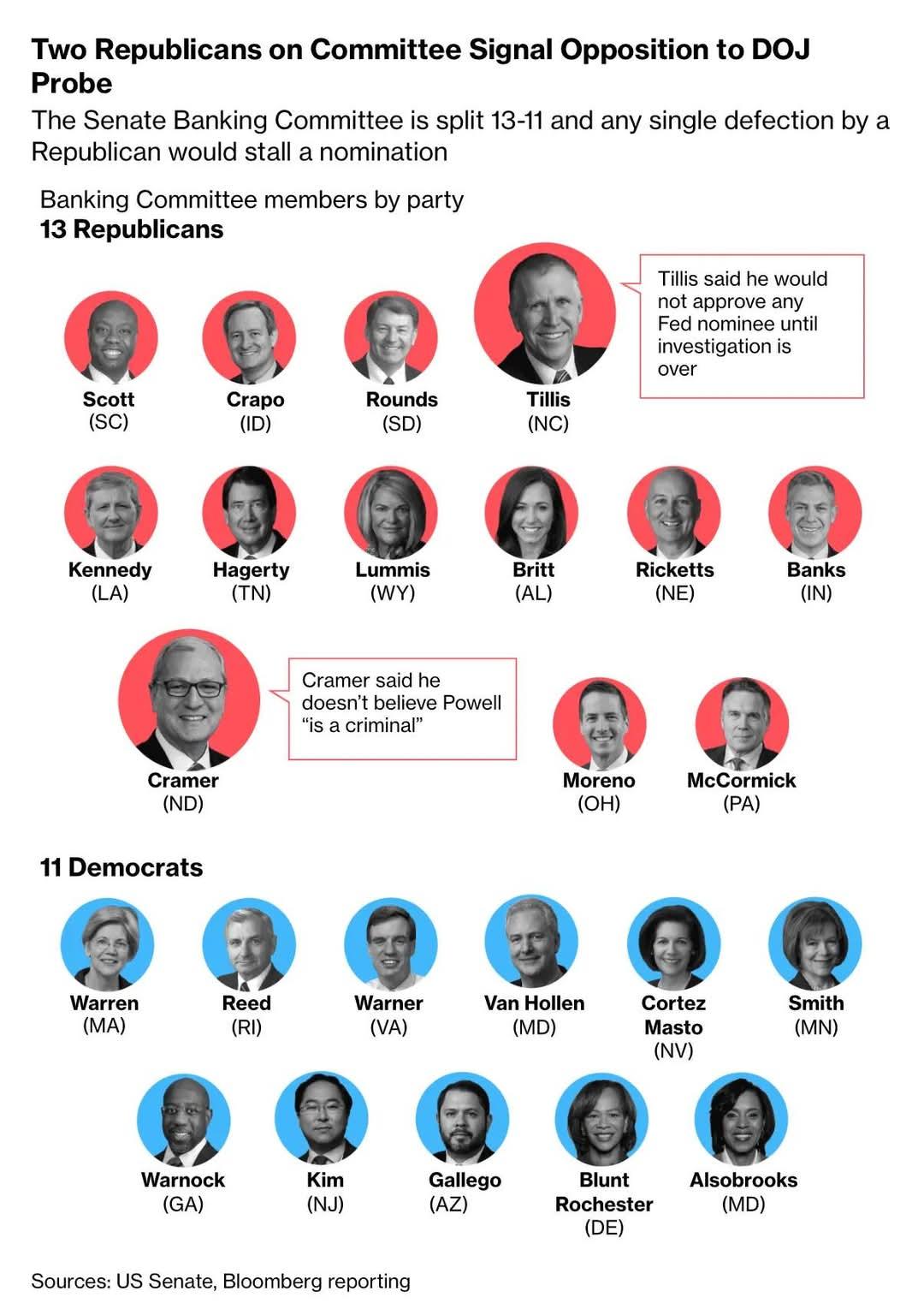 美国司法部送达暗示可能追究刑责的传票后,不仅鲍威尔首次正面指控总统试图夺权,就连共和党内部也有人公开发出警告,扬言将否决美联储人事任命案。对特朗普团队而言,更棘手的是,即便鲍威尔在5月卸任主席一职,仍可留任理事至2028年,成为制衡新任主席的权力核心——这反而让白宫原本想逼迫鲍威尔离职的计划适得其反。 事实上,参议院银行委员会目前的席位比例为13比11,只要有一名共和党议员倒戈,任何美联储人事案都会直接搁置。而汤姆·蒂利斯(Thom Tillis)已明确表态,在司法部调查结束前不会批准任何美联储(Fed)提名,这相当于手握否决权。 与此同时,凯文·克拉默(Kevin Cramer)也公开表示,不认为鲍威尔是罪犯。可见共和党内部对于用司法手段迫使美联储让步的态度,其实并不统一。 这让特朗普政府陷入了极为尴尬的境地:原本想通过调查向美联储施压,却可能先在党内这一关受阻。短期内,不仅鲍威尔的去留悬而未决,就连美联储后续的人事安排、货币政策方向,也都被国会牢牢牵制。 (新闻源自网络,仅供参考)