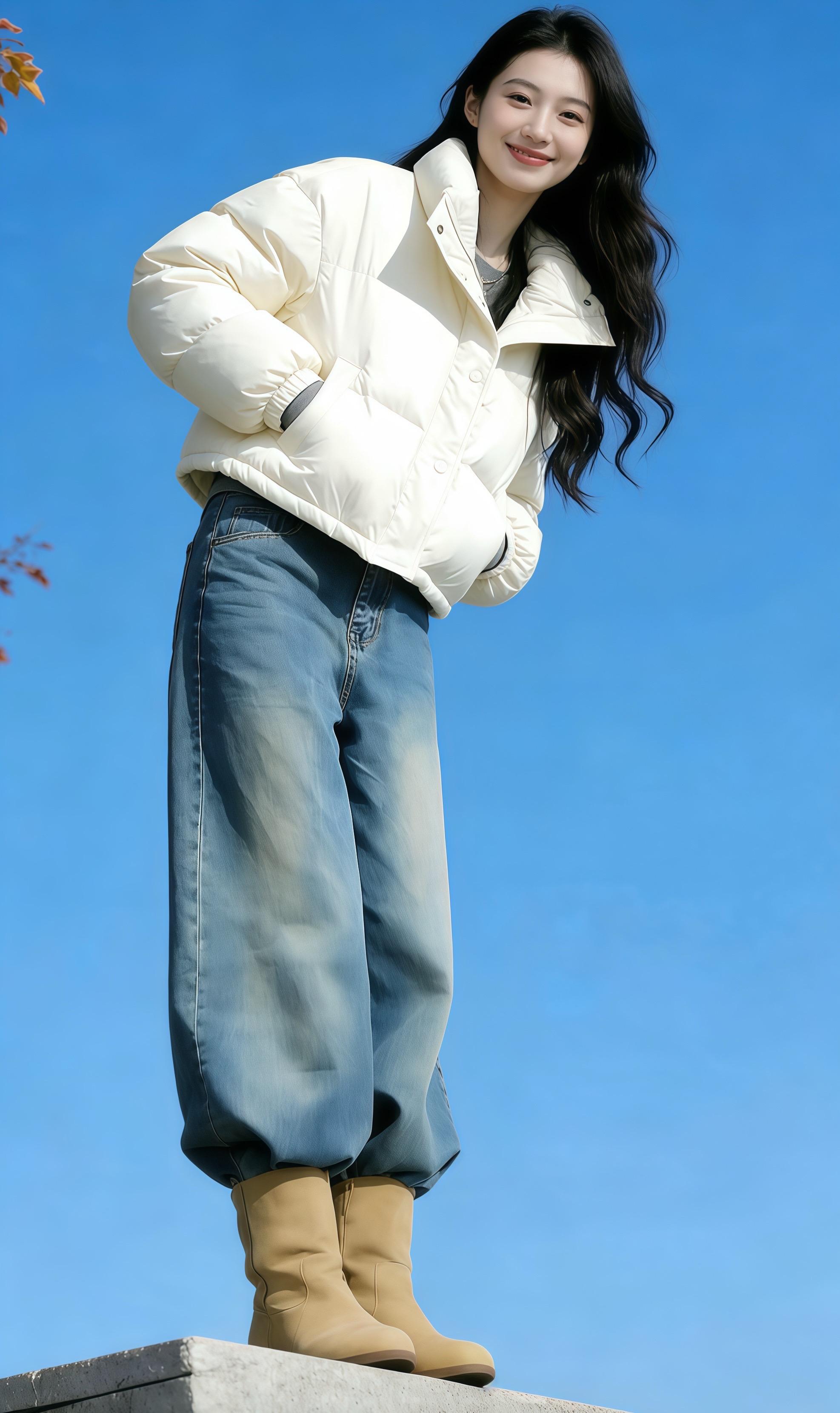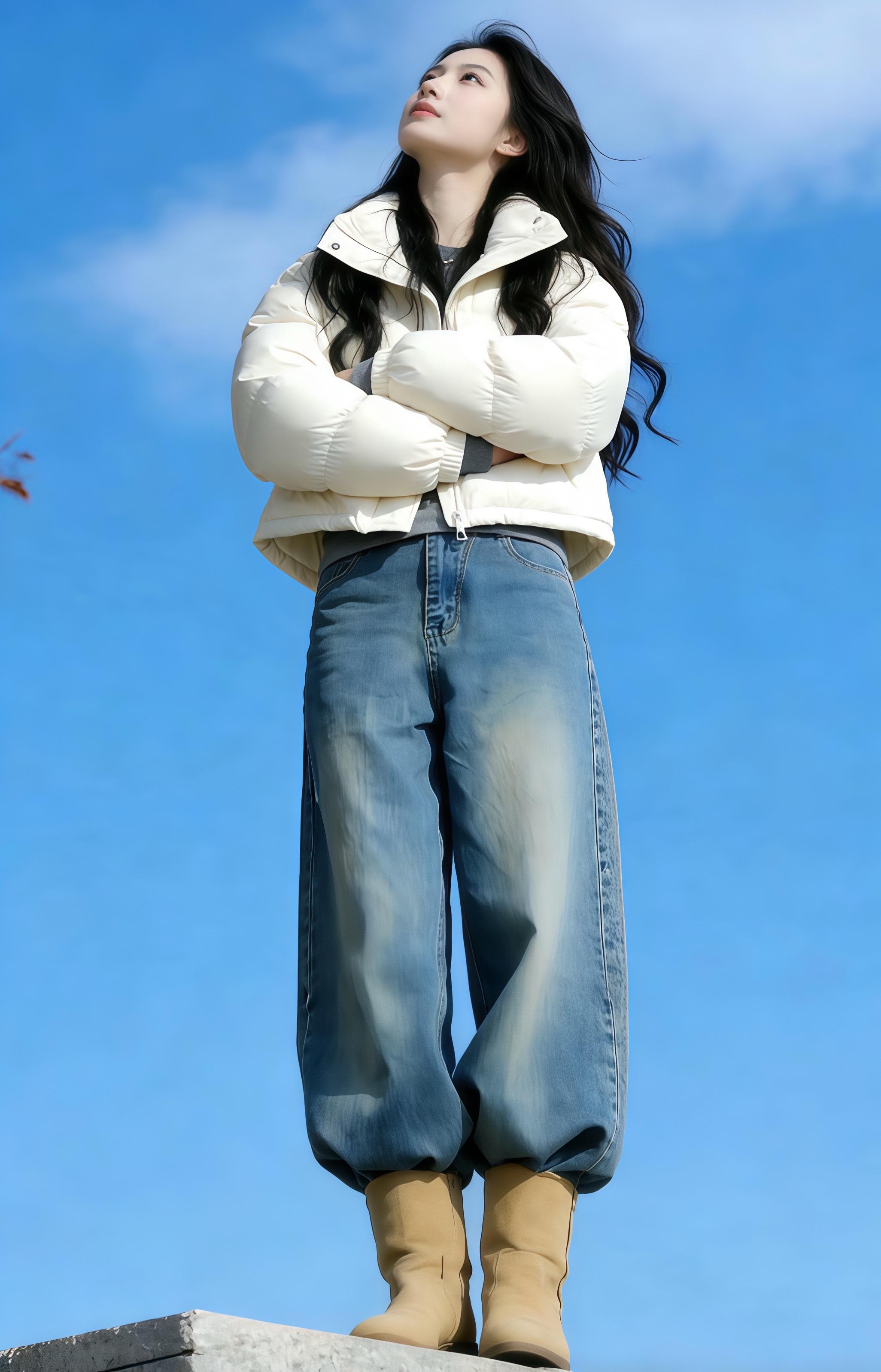 粉白格纹衬衫松垮地系在腰间,高腰蓝色紧身牛仔裤紧紧贴合腿部线条,将比例拉得恰到好