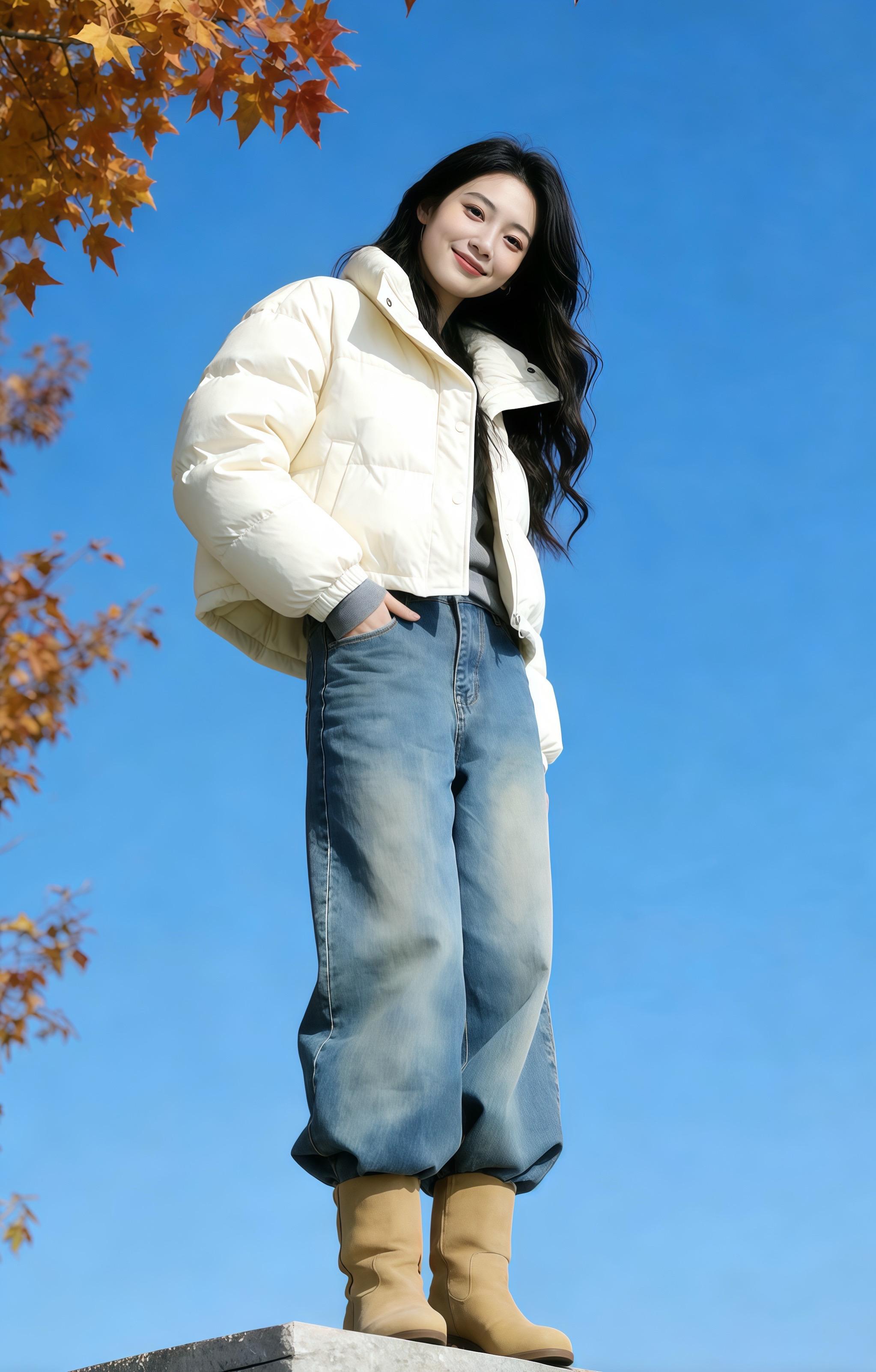 棕色大衣与落叶相映成趣,时尚与自然完美融合。