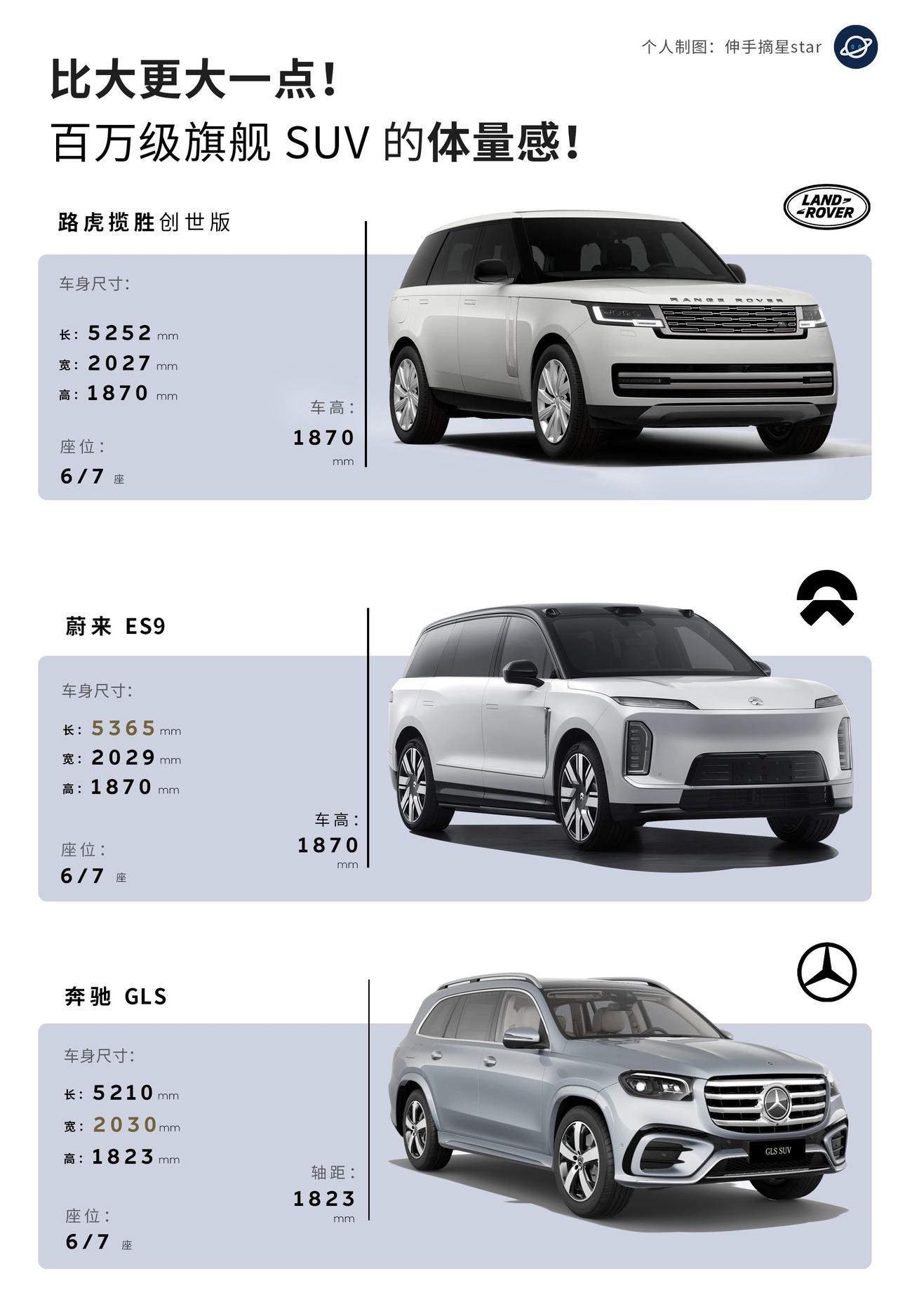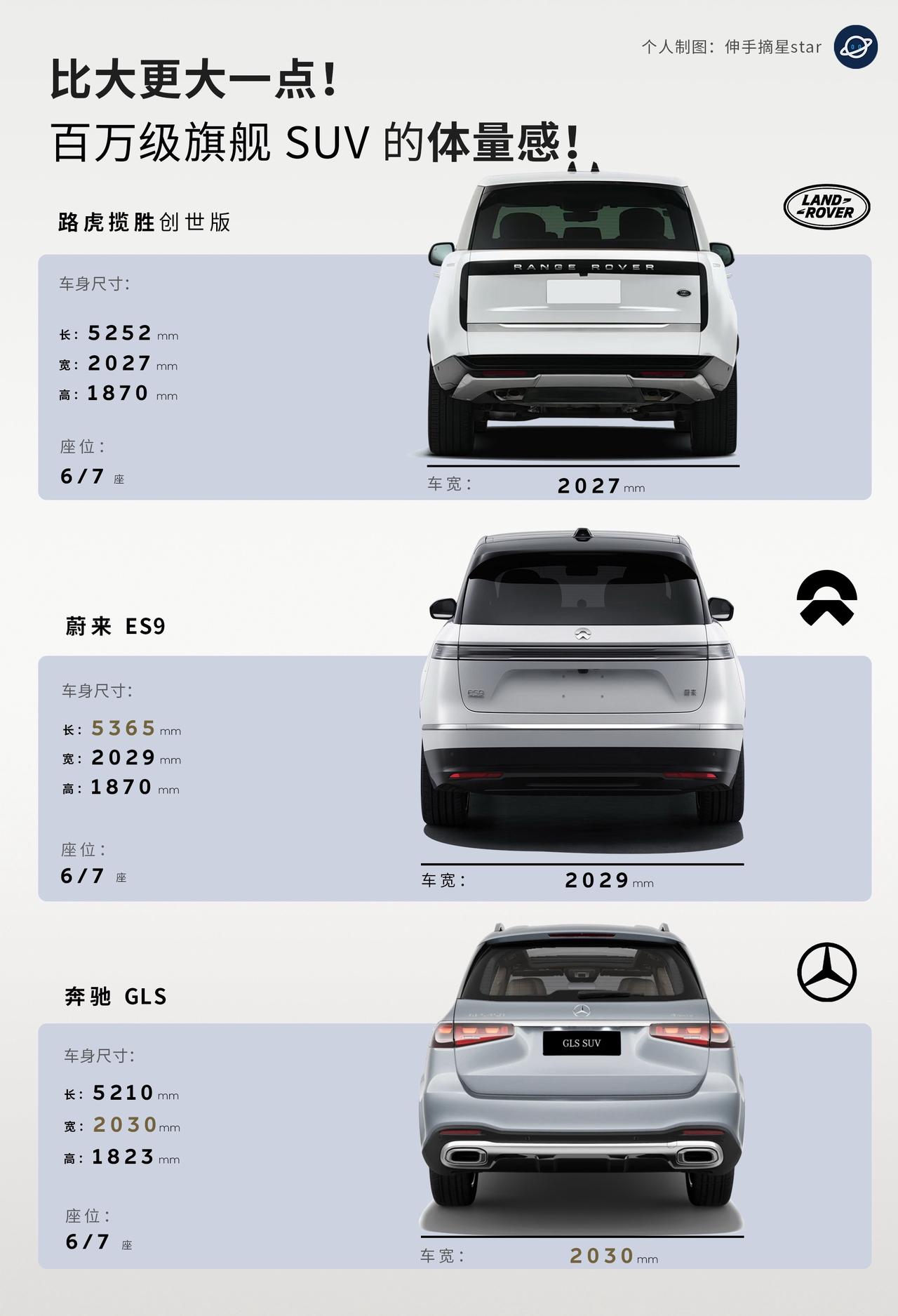 百万级SUV 体量感! ES9 5.365米 看数值觉得不够大, 我们的标准停车位尺寸是:长5.3X 宽2.4米。 现在看ES9, 长5365 宽2029的尺寸非常好,很克制, 正常的车位都能停。 车长没有特意追求到5.4米。 同时比揽胜加长版,奔驰GLS 都大一圈。 已经是属于全尺寸级别, 庞然大物了。 蔚来 蔚来ES9 豪车 揽胜