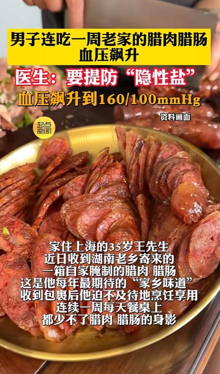“悲剧还是发生了!”近日,上海,一男子收到老家的腊肉后,每顿饭都要吃上几口,结果过了一周,男子开始头晕乏力,口干舌燥,去医院检查后,才发现血压已经飙升,远超正常水平,而罪魁祸首,就是他每顿吃的腊肉!网友:爱吃腊肉的我哭了! 周文(化名)平时生活节奏快、饮食也不规律。 上周,他的老家寄来一大箱腊肉,包装得整整齐齐,腊香四溢,还附带一封小纸条:“这是家里今年做的腊肉,吃点解馋,也当过年味儿。” 看着那整齐的腊肉,周文忍不住想起了小时候春节回老家,桌上铺满腊肉、腊肠的日子,那种香味总让人食欲大开。 刚开始,他只是每天中午切几片腊肉配米饭,晚上也会配上几片,用热水稍微焯一下,口感香糯鲜美,肥而不腻。 随着一天天吃,周文发现自己开始有点上瘾:腊肉的香味在唇齿间回荡,仿佛小时候的年味被唤醒,他甚至下班回来,迫不及待地打开冰箱,切上几片生吃,或者简单煎一下。 然而,仅仅一周后,身体的“警报”开始响起。一天上午,周文在办公室开会时突然感觉头晕目眩,整个人像被无形的力拉扯着站不稳,手心出汗,眼前一阵一阵发黑。 他以为是昨晚睡得不好,便强打精神坚持工作,但午餐吃完腊肉后,症状更加明显——心跳加快,浑身乏力,连拿笔记本电脑都觉得吃力。 下班后,周文回到家中,仍然觉得头晕得厉害,嘴巴异常干燥,渴得喝水也止不住口渴感。他揉着太阳穴,心里暗暗嘀咕:“不会是感冒吧?最近天气也没怎么变啊……” 但随着时间推移,他发现不仅头晕加重,甚至出现轻微的胸闷和心悸。这让他彻底慌了神。 第二天,他去附近医院做了检查。医生看到他测得的血压数值时,眉头紧锁:“你的血压明显超标,属于急性高血压,需要马上控制。” 周文一愣:“血压?我平时很少测啊,也没什么家族史啊……”医生叹了口气,耐心解释:“你最近的饮食非常重要。 你每顿都吃腊肉吧?腊肉含盐量极高,脂肪多,连续食用会导致血压快速上升,心脏负担加重。你的症状就是典型的盐分过量引起的急性高血压。” 周文一听,整个人都傻了:自己以为吃的是“家乡味道”,竟然成了身体的隐形杀手。他回想过去一周的饮食,每顿腊肉、每口米饭,都像是一场潜伏的危机。 他甚至惊讶地发现,腊肉里那股咸香背后,隐藏着的盐分,已经悄悄地把自己血管里的压力推向了危险边缘。 医生为他做了详细的血压监测和心脏检查,并给出了紧急治疗方案,还嘱咐他要立即停止高盐饮食。 周文回到家,看着冰箱里还剩下半箱腊肉,心里既心疼又愧疚。他原本想每顿都吃一点,享受家的味道,却没想到腊肉背后的高盐量几乎让自己“送命”。 家人听说后,也赶紧打电话过来劝他少吃:“老周啊,你快别吃了,你身体最重要,家乡的味道留到回家再尝也行啊。” 周文挂了电话,坐在桌前,看着那一盘盘煎得香喷喷的腊肉,忍不住叹气。他突然明白,自己对美味的追求,竟然与健康形成了尖锐冲突。 网友看到周文的经历后,也纷纷感慨:“爱吃腊肉的我哭了!”、“原来腊肉的危害这么大,我每年春节都要吃个够。” “我也得去测测血压了,不能小看咸食啊。”短短几天,这条新闻在社交媒体上被刷屏,无数“吃货”们开始重新审视手里的腊肉,开始意识到,即便是最怀念的家乡味,也可能成为健康隐患。 经过医生的调理和严格控制饮食,周文的血压逐渐恢复正常,他开始学会科学饮食:偶尔吃腊肉,但必须与大量蔬菜水果搭配,并控制量;同时增加运动,避免血压再飙升。 每当有人问起这次经历,他总是半开玩笑半认真地说:“别小看家乡腊肉,它看着香,吃多了能上医院!” 这件事情,让周文深刻体会到,食物虽美味,健康才是最重要的保障。他再也不会像之前那样,每顿饭只顾着享受口感而忽略身体的信号。 如今,他把剩下的腊肉分装好,冷冻保存,偶尔取出一点,慢慢品味,而不是一股脑儿吃完。