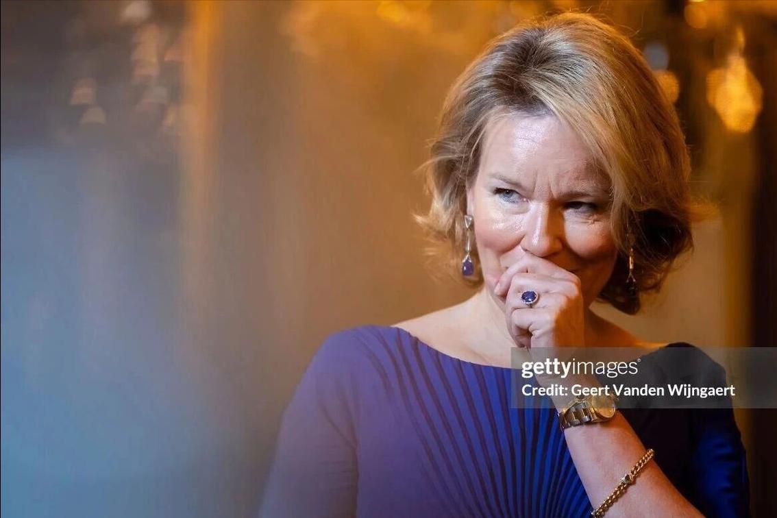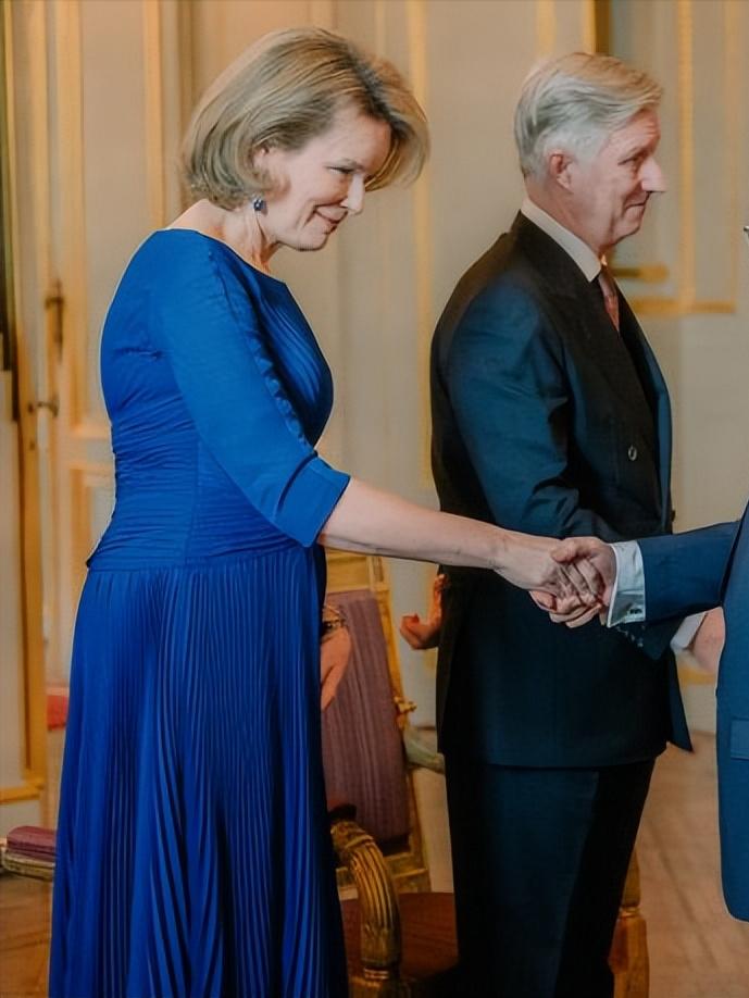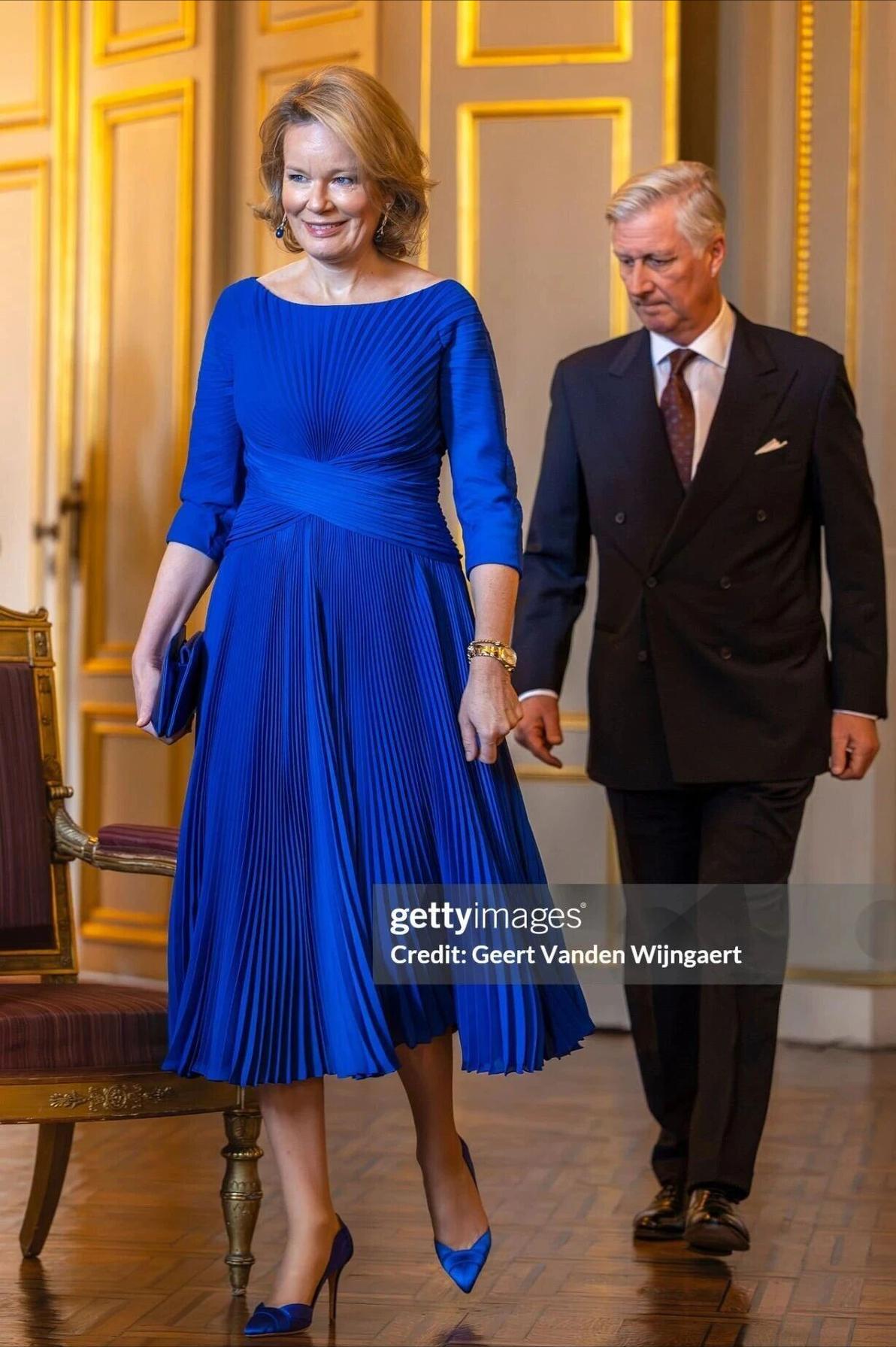 比利时王室新年招待会[笑] 玛蒂尔德王后穿了一条宝蓝色新裙子, 修饰她高大的身材