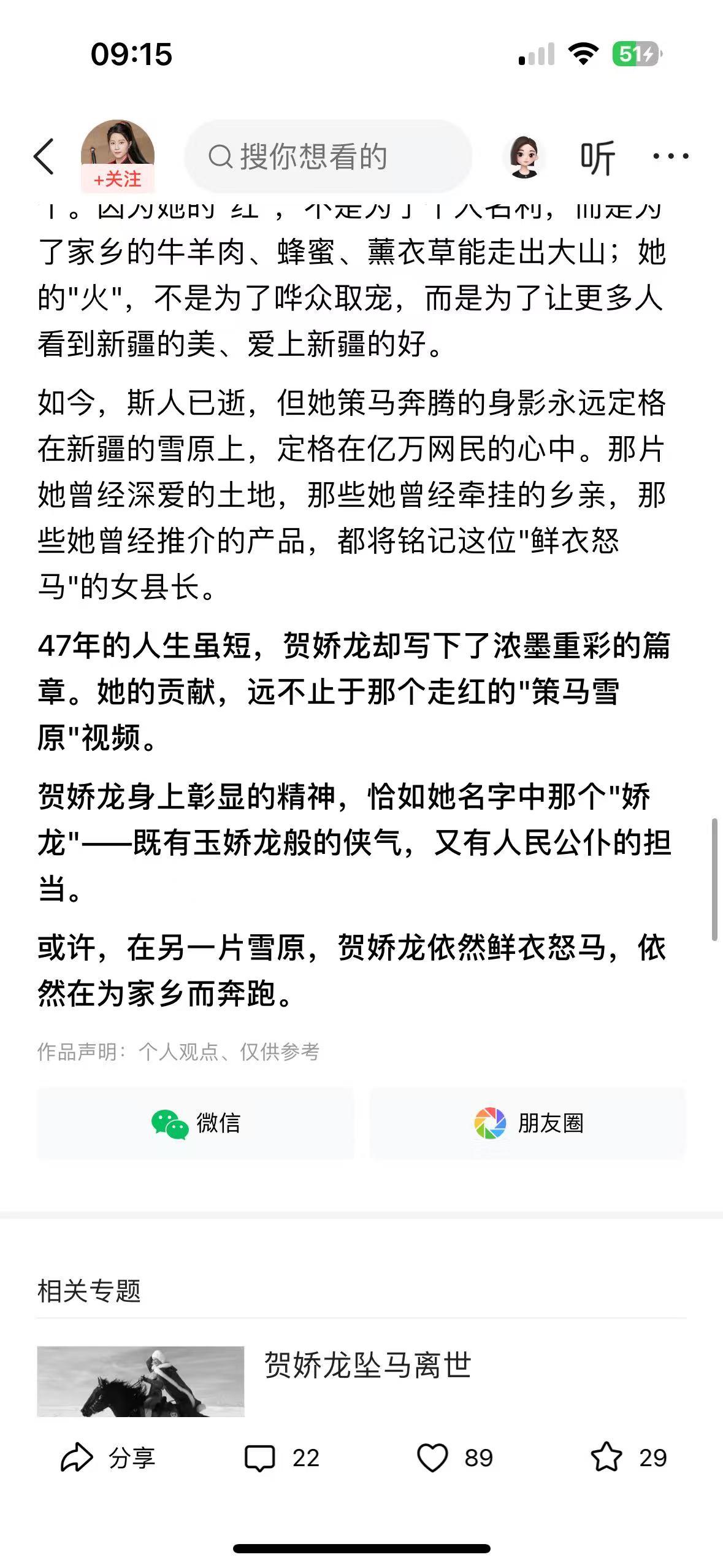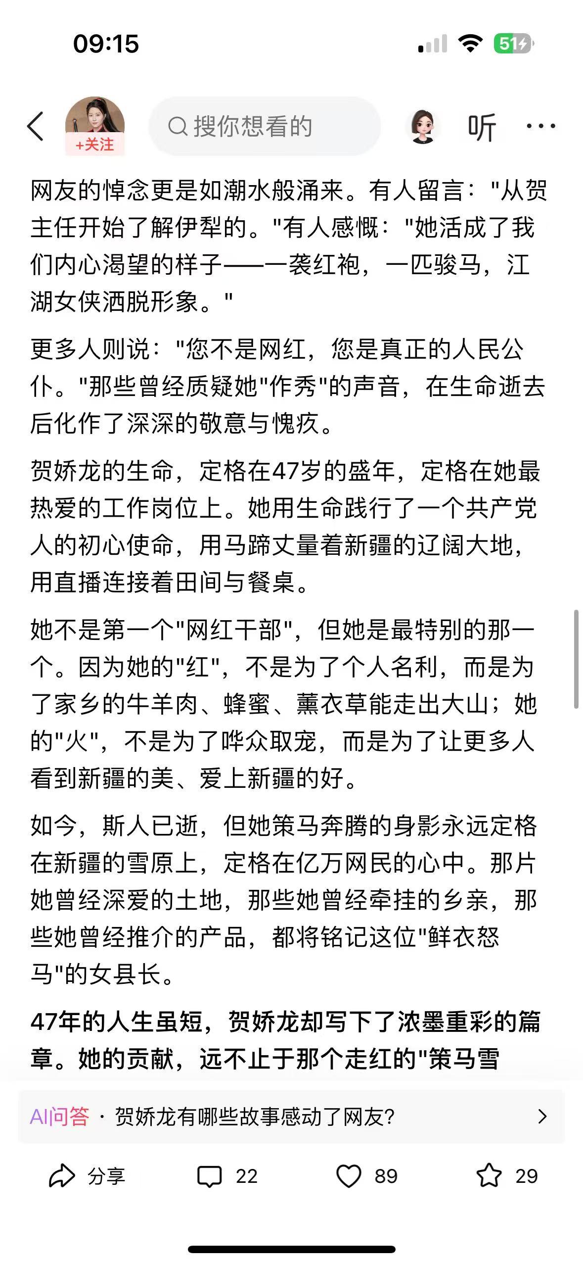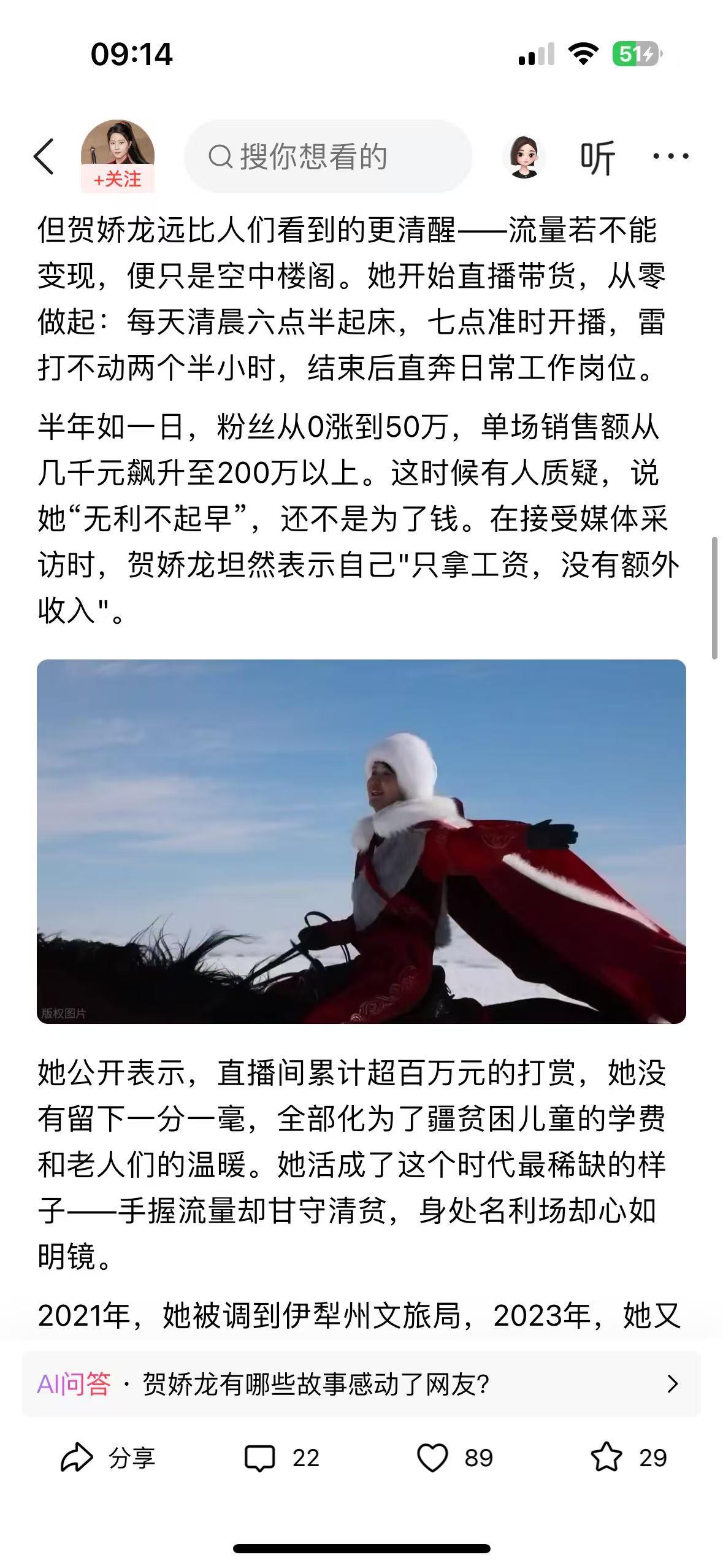 “马背上的女县长”贺娇龙,于1月11日拍摄助农素材时意外坠马,经全力抢救无效,不幸离世,年仅47岁。这句“若为热爱,便所向披靡”,成了她留给世界的最后告白。 作为援疆知青后代,她深耕基层多年,深知家乡困境。2020年,身披红斗篷策马雪原的视频让昭苏出圈,她顺势直播助农,每日清晨开播,半年吸粉50万,带动全疆农产品销售破百亿,却分文不取额外报酬,百万打赏全捐贫困群体。 她曾多次坠马仍坚守,只因骏马与红袍是家乡引流的密码。五年500余场直播,从县到州再到自治区,她始终为家乡奔走。她用生命践行了共产党人的初心,活成了流量时代最清醒的模样。 贺娇龙从不是虚名在外的网红,是把根扎在新疆的公仆。一次次坠马的疼,日复一日的坚守,都藏着对乡亲的惦念。 47岁的生命太匆匆,可她策马雪原的身影、为民奔波的赤诚,永远刻在人心。这才是真正值得我们铭记与敬仰的人。