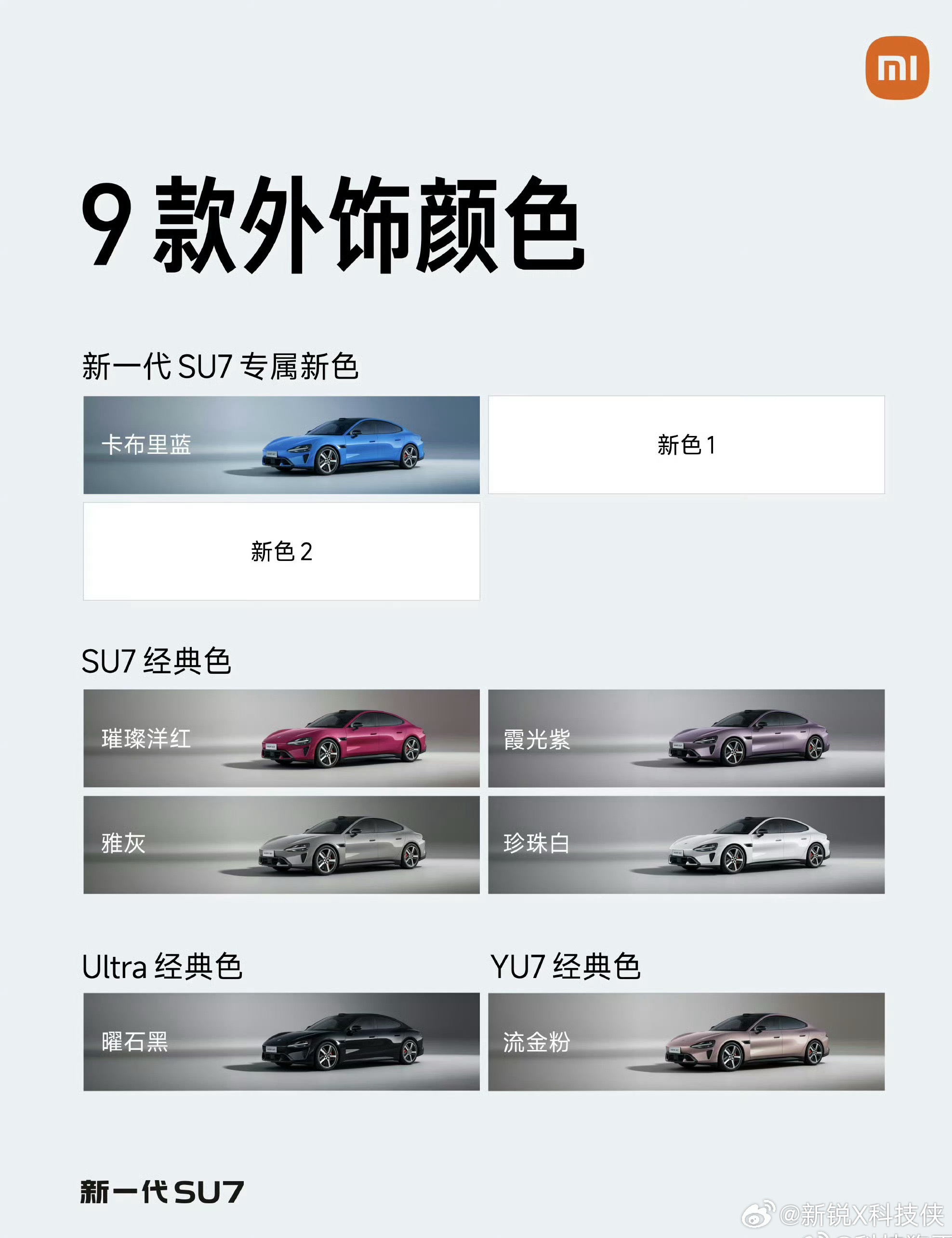新一代小米SU7九款颜色公布先夸一句,SU7这造型是真经典,放到现在看依旧好看,说它是50万内最好看的轿车,我觉得没啥毛病。小米的审美一直都在线,选颜色这块从来没失手过,之前的海湾蓝就够惊艳了。这次新出的卡布里蓝一眼高级还显贵,妥妥的爆款预定,我感觉大概率又要卖断货。从霞光紫到鹦鹉绿再到紫水晶,小米之前出的颜色全是爆款,这次新增的几款也不用纠结,基本都不会踩雷。不管你是喜欢经典款还是想选新色,都能挑到合心意的。我觉得卡布里蓝大概率又会成为热门色,毕竟这种显质感又不挑场景的颜色,不管你是日常通勤还是出门自驾都很搭。