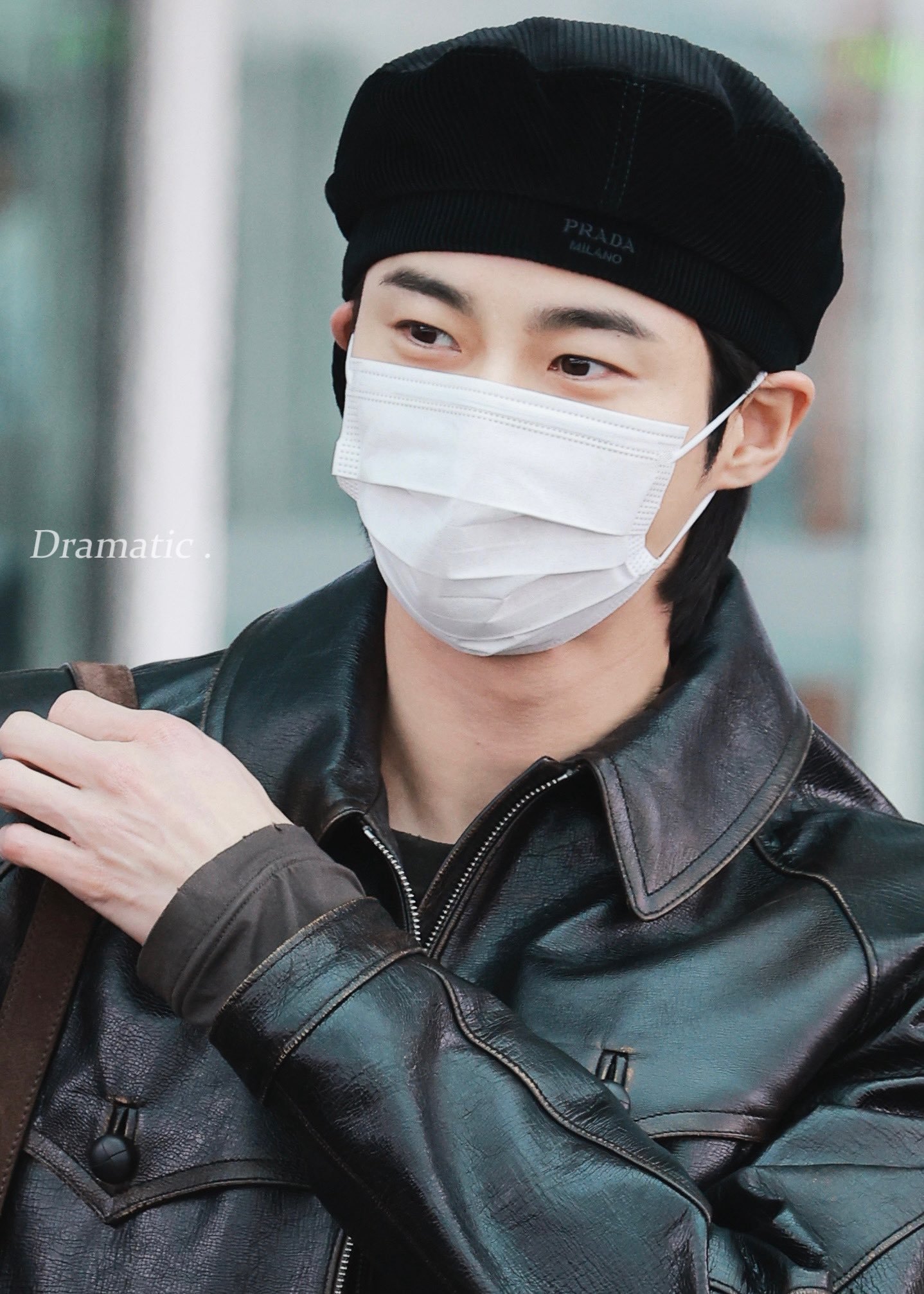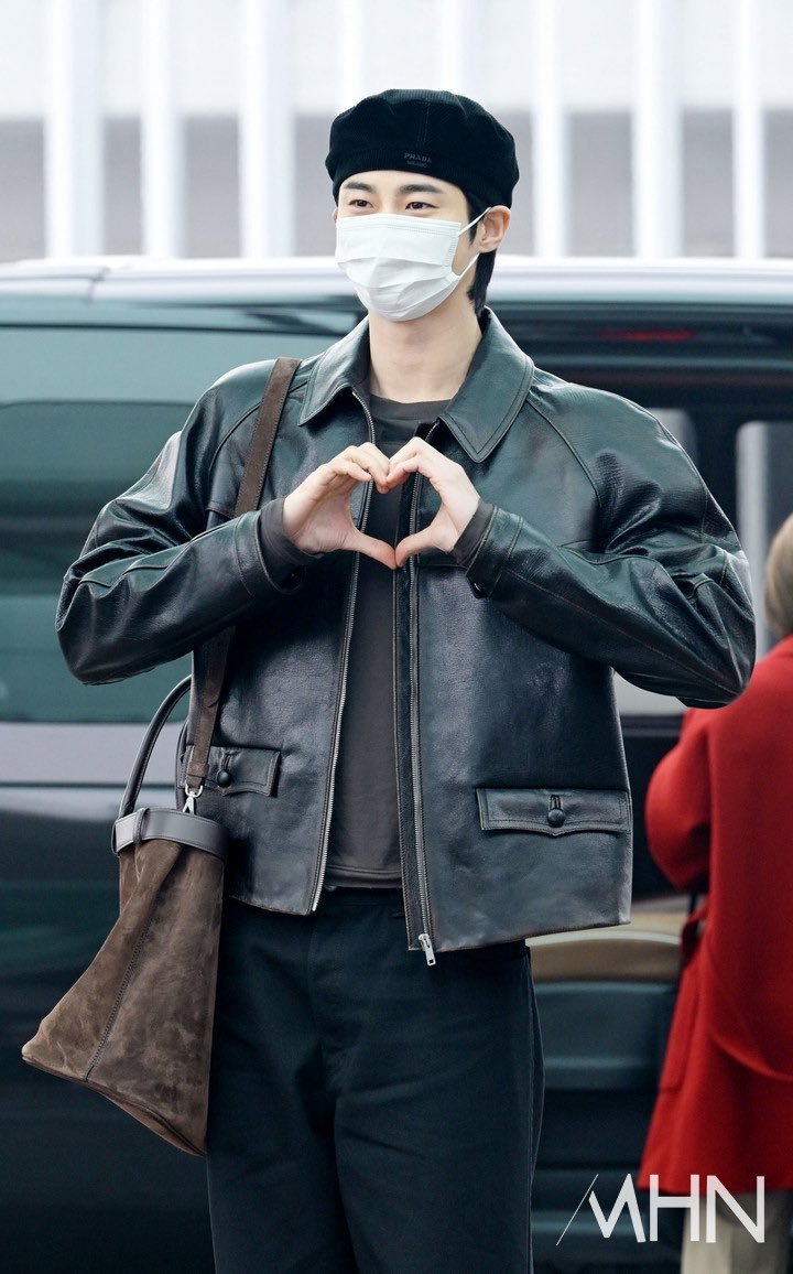 边佑锡 —— PRADA 2026秋冬男装大秀,启程米兰之旅,复古深棕皮衣外套搭配黑色贝雷帽,这是他第三次受邀出席品牌新季大秀。 男装周 米兰男装周 边佑锡