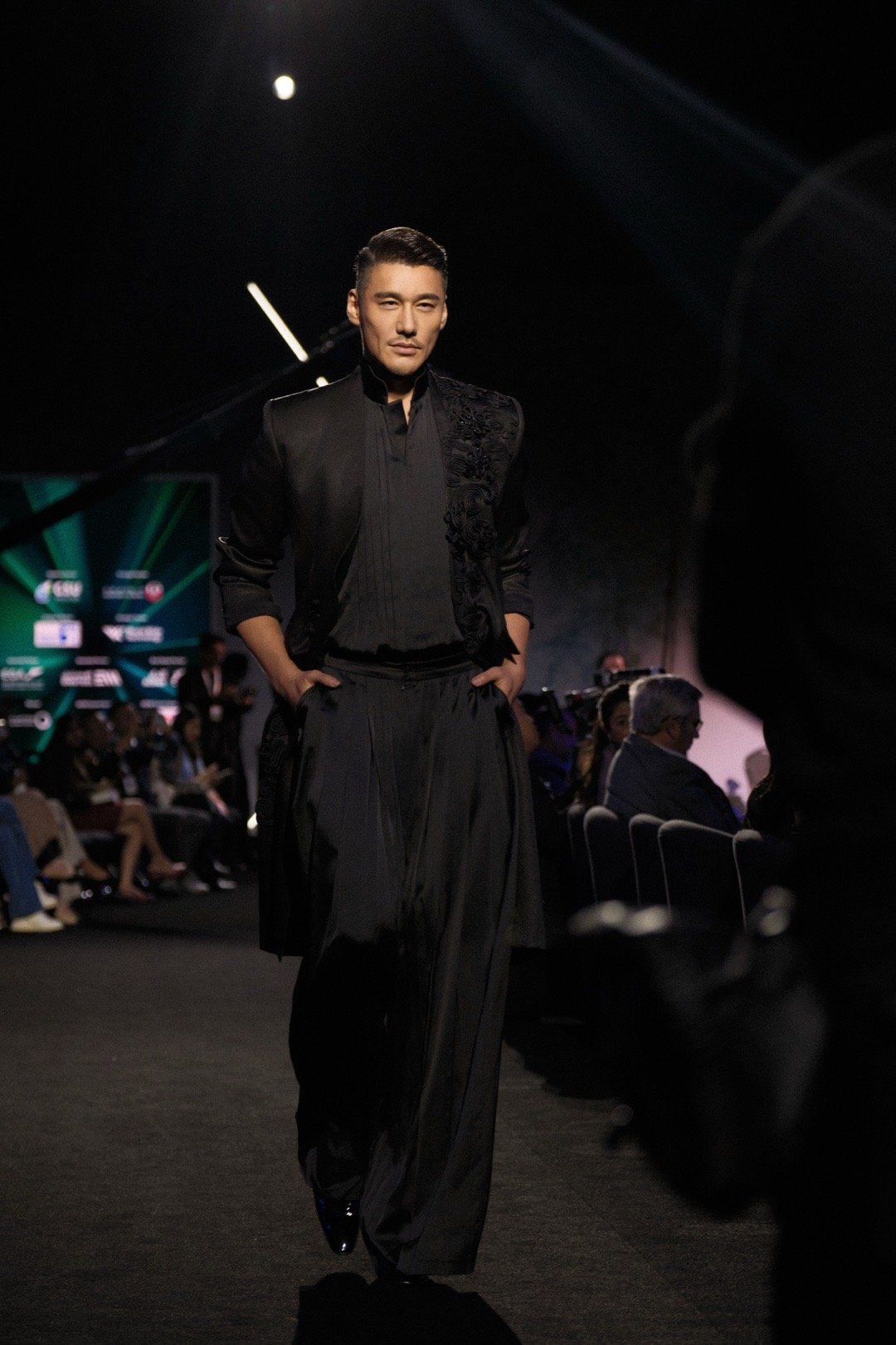 胡兵给阿布扎比上点东方震撼 胡兵这身是写给阿布扎比的一封东方情书。香云纱承载文化