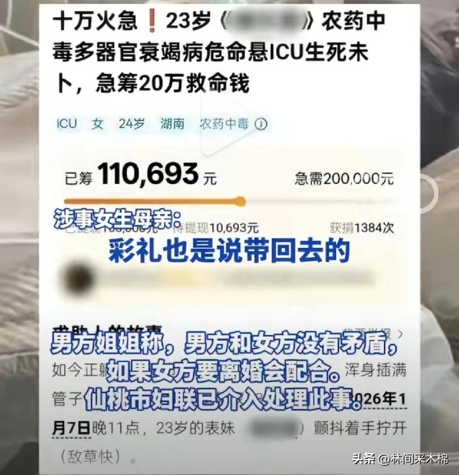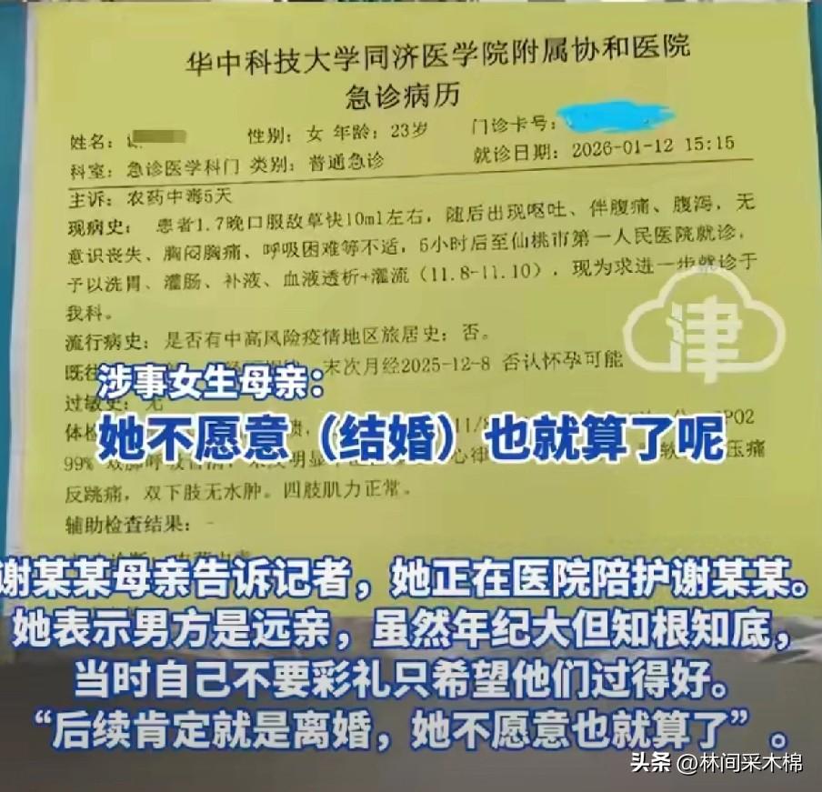 仙桃23岁女孩被逼婚后喝下农药,一个多星期了,还在ICU抢救。女孩父母离异,她本来是判给父亲的,后来她母亲看她过的不好,就把她接到一起生活。但是母亲在外地上班,她和妹妹就自己待在老家,有时寄人篱下,借住在亲戚家。 女孩子23岁了,她母亲把一个远房亲戚介绍给她,这个男的38岁左右,比女孩大不少。母亲的想法是知根知底,可靠,女孩本不愿意,但是从小寄人篱下长大,性子软,没有坚定的拒绝。两人见过面,一起吃过饭。男方催着领结婚证,说是领了结婚证才好买房子。 没想到两人领了结婚证以后,男方也不提买房了,彩礼,婚纱照的事也没了动静。女孩就不愿意了,她让母亲去找男方家里谈离婚,但母亲不去,只是说,等到办婚礼的时候你不出现,别人就都知道你们分开了。女孩一时想不开就喝了农药。 事情发生以后,她母亲说,她也是想让女儿好好过日子的,既然她不愿意,离婚就是了。 男方也站出来说,没有说不买房,不给彩礼,都准备好买房付定金了,只是约女孩约不出来。 总之,没出事之前,每个人都不把女孩儿想法当回事。出事后所有人都没错,全都是女孩的错。 她如今还在ICU里躺着,母亲在照顾她,表姐帮忙筹钱交住院费。母亲还为了向亲戚借钱给她治疗而跟亲戚吵架。看起来这个妈妈也是爱女儿的,只是思想迂腐,方式不对,完全不考虑女儿的意见,才酿成了悲剧! 女孩在外面工作当保安,存了4.5万块钱。在案发前的20多天,母亲因为在仙桃买了一个十几万的房子,钱不够,把女孩儿钱借走了。女孩身无分文,最后买农药只花了2.45元。 这就是社会底层小角色,才23岁,已经尝遍人间疾苦。这个破破烂烂的世界,既然来了,就好好爱自己。自己的事情自己做主,勇敢的抗争,伤害自己换取别人的转变,不是明智之举。可是哀莫大于心死,如果不是被伤透了心,谁会选择伤害自己?