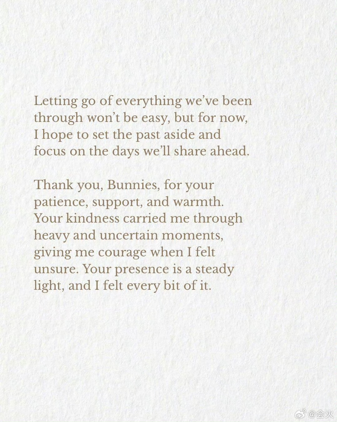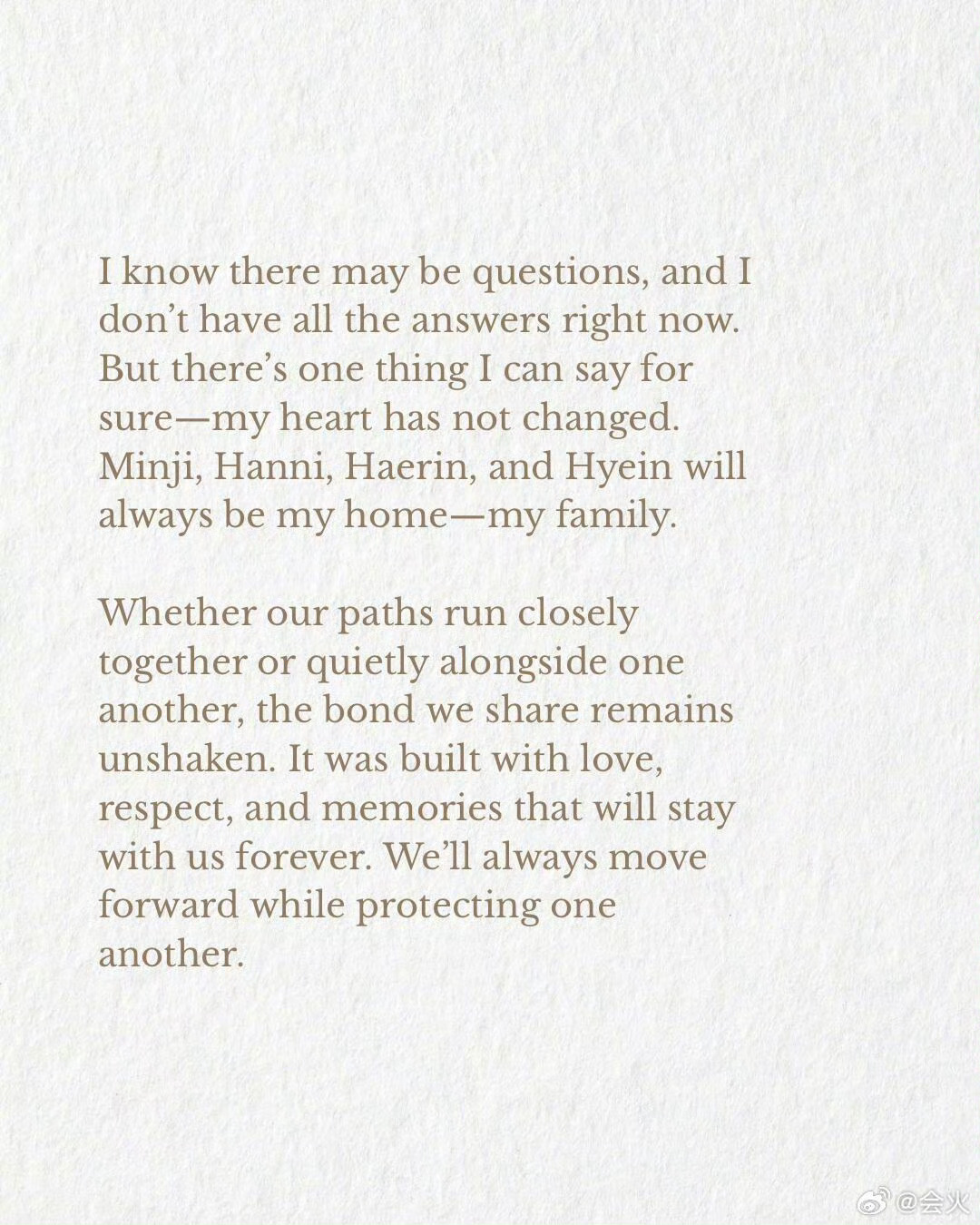 “minji、hanni、haerin和hyein永远是我的家——我的家人。无论我们的道路是紧密相连还是静静并肩而行,我们之间的纽带始终坚不可摧。它由爱,尊重和永存的回忆铸就。我们将永远携手前行,彼此守护。” 五个人的错不该她一个人承担吧?Danielle发文回应退团