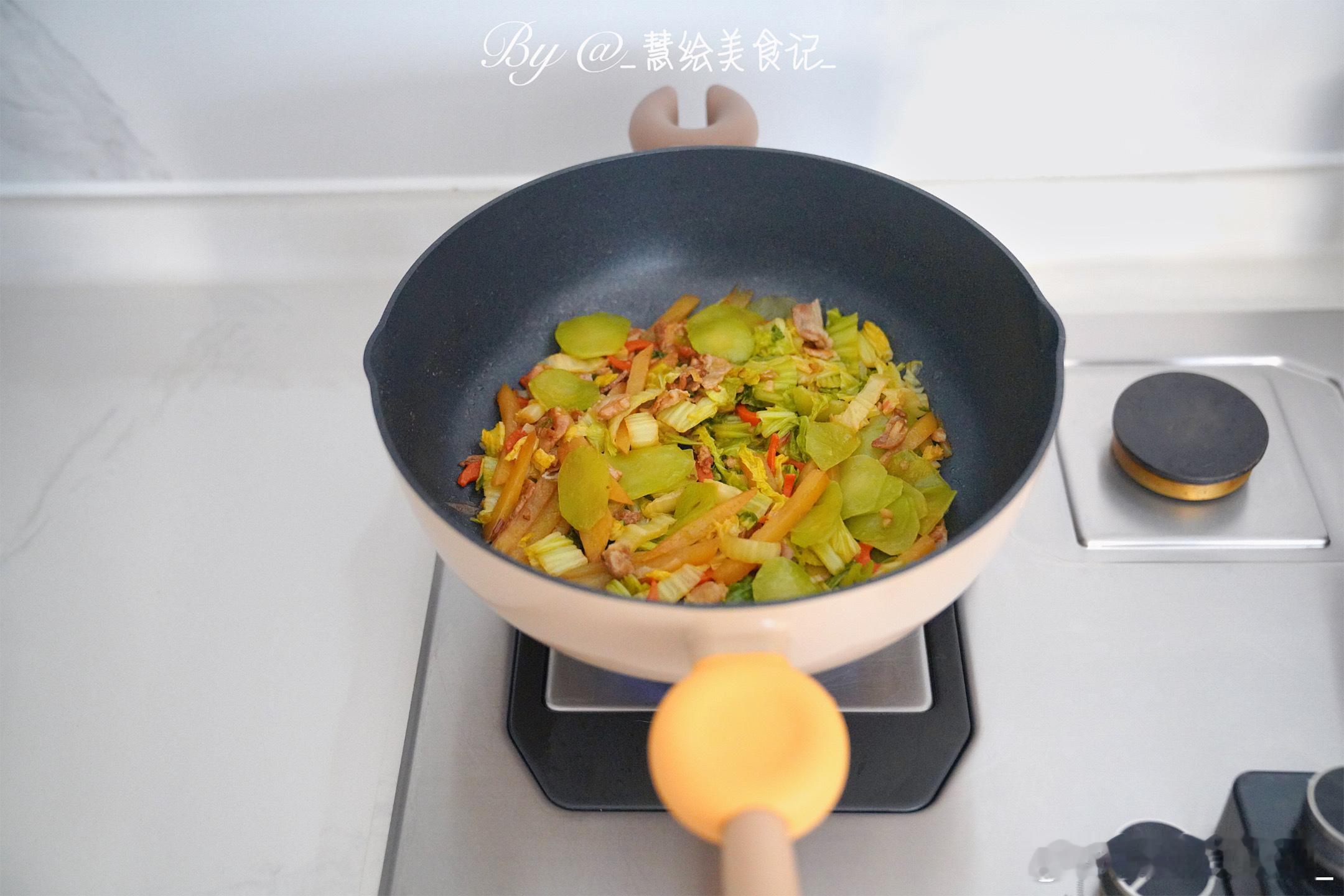 周五啦早午餐莴笋土豆白菜炒肉、玉米饼、荠菜小馄饨、山药豆浆、坚果、小番茄~好好吃