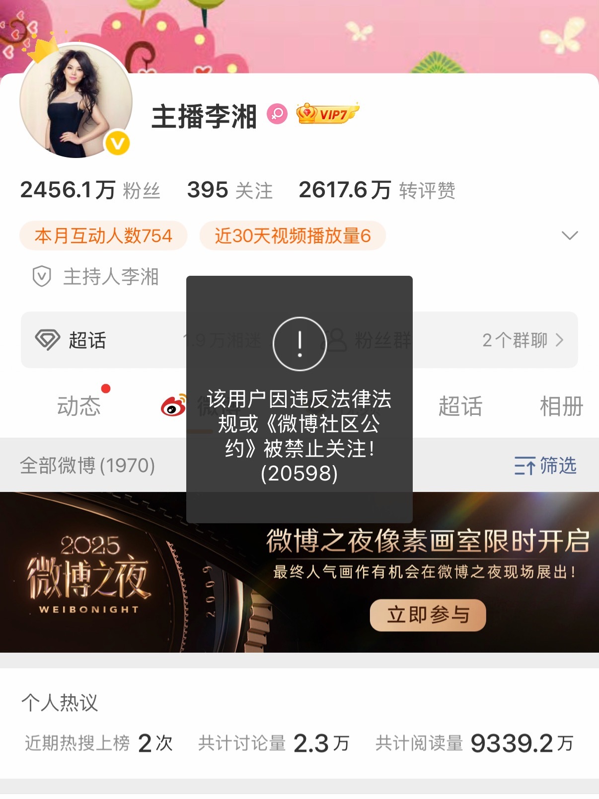 李湘多平台账号被禁止关注李湘在网络多个平台账号被禁止关注。