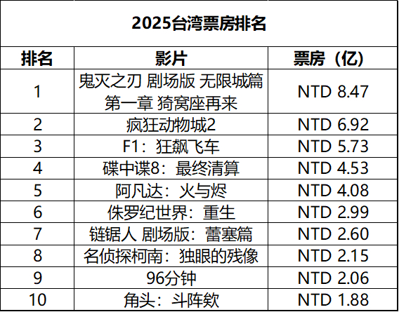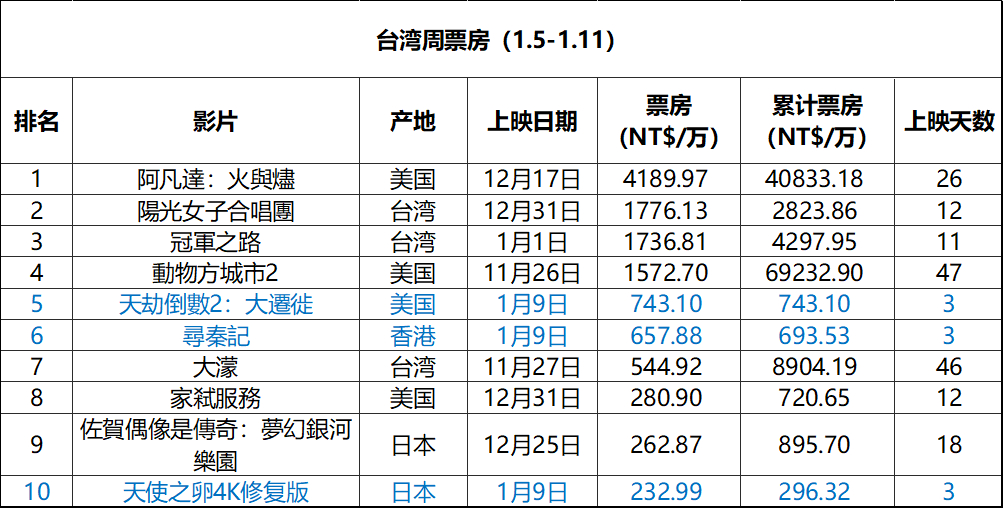 2025年第2周台湾票房 :1.《阿凡达3》四连冠,累计票房破4亿新台币;2.《阳光女子合唱团》次周逆跌,走势强劲;3. 纪录片《冠军之路》累计票房破4300万,《大濛》累计票房破9000万;4.《末日逃生2:迁移》在新片中成绩最佳。(单位:新台币 数据:台湾电影及视听文化中心)