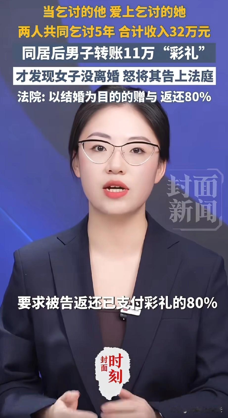 太炸裂了!一男一女在乞讨的过程中认识,然后恋爱同居在一起。男方觉得时机成熟后,陆续转给女子11万当作彩礼,准备迎娶女子。 结果还没结婚男子就发现女友骗了自他,女友早就结过婚,有家庭了。男子气愤之余,想要回他给的11万彩礼。女子不同意,男子把女子告上法庭,要求女子返还全部彩礼。 法院判女子返还彩礼的80%,女子不接受判决结果,重新上诉。她认为她和男子共同乞讨5年,一共乞讨所得有32万,这11万是她应得的。 法院认为根据男方提供的证据,男方转钱的目的就是为了和女方结婚。所以判决女方败诉,维持原判。 有网友说,我奇怪的是什么样的乞讨5年能赚32万?这只能说,世界之大,无奇不有啊。 对于这件事,你怎么看呢?