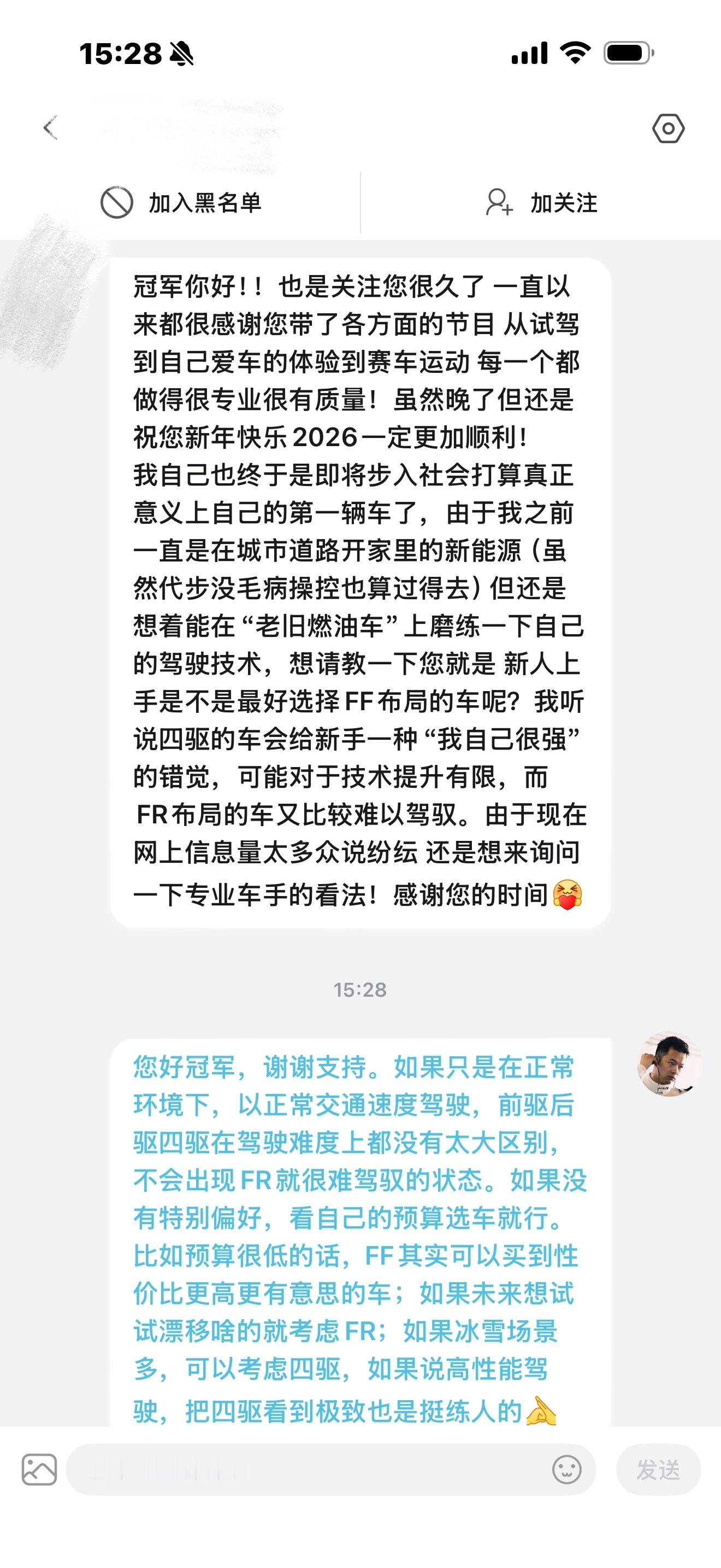普通人开后驱 也并不会有特别的难度您好冠军,谢谢支持。如果只是在正常环境下,以正常交通速度驾驶,前驱后驱四驱在驾驶难度上都没有太大区别,不会出现FR就很难驾驭的状态。如果没有特别偏好,看自己的预算选车就行。比如预算很低的话,FF其实可以买到性价比更高更有意思的车;如果未来想试试漂移啥的就考虑FR;如果冰雪场景多,可以考虑四驱,如果说高性能驾驶,把四驱开到极致也是挺练人的欣哲频道 冠军问答 后驱