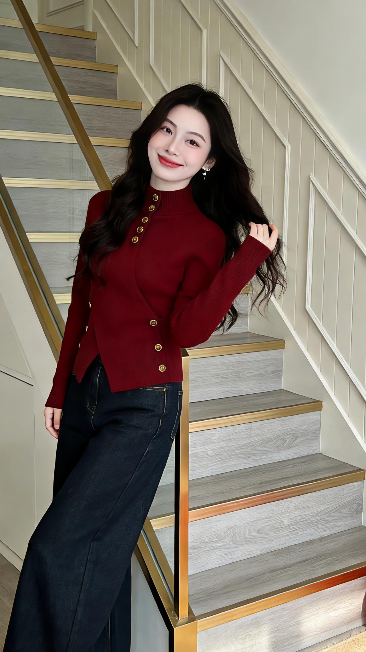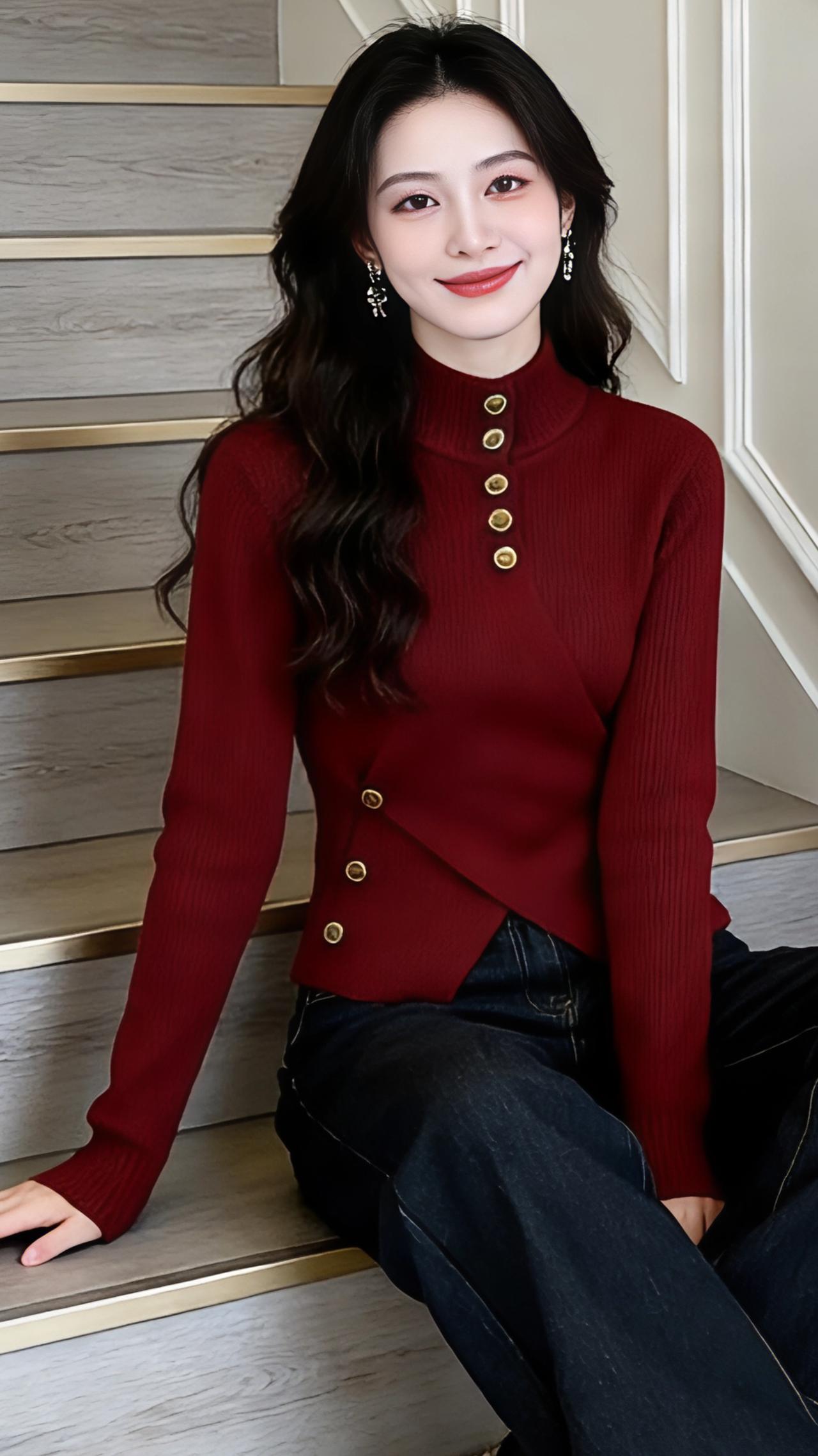 红韵织暖 酒红色的针织衫似揉了冬日的暖阳,金扣错落成灵动的音符,在衣摆处缀出