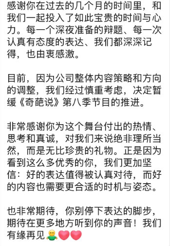 选手称奇葩说项目暂停网传奇葩说暂停启动 我的下饭神综要再等等了!网传《奇葩说 8》因米未内容策略调整暂缓推进,不少备赛辩手已收到官方通知,筹备数月的心血暂时搁置。那些期待的唇枪舌剑、脑洞碰撞,只能盼后续重启再相见~