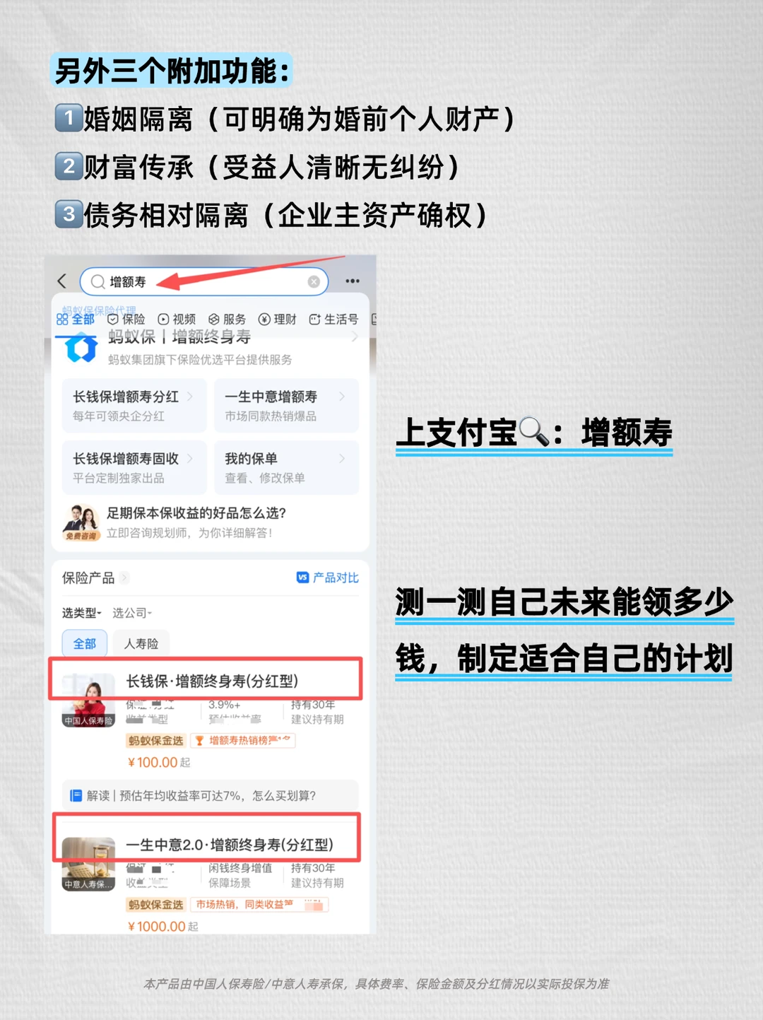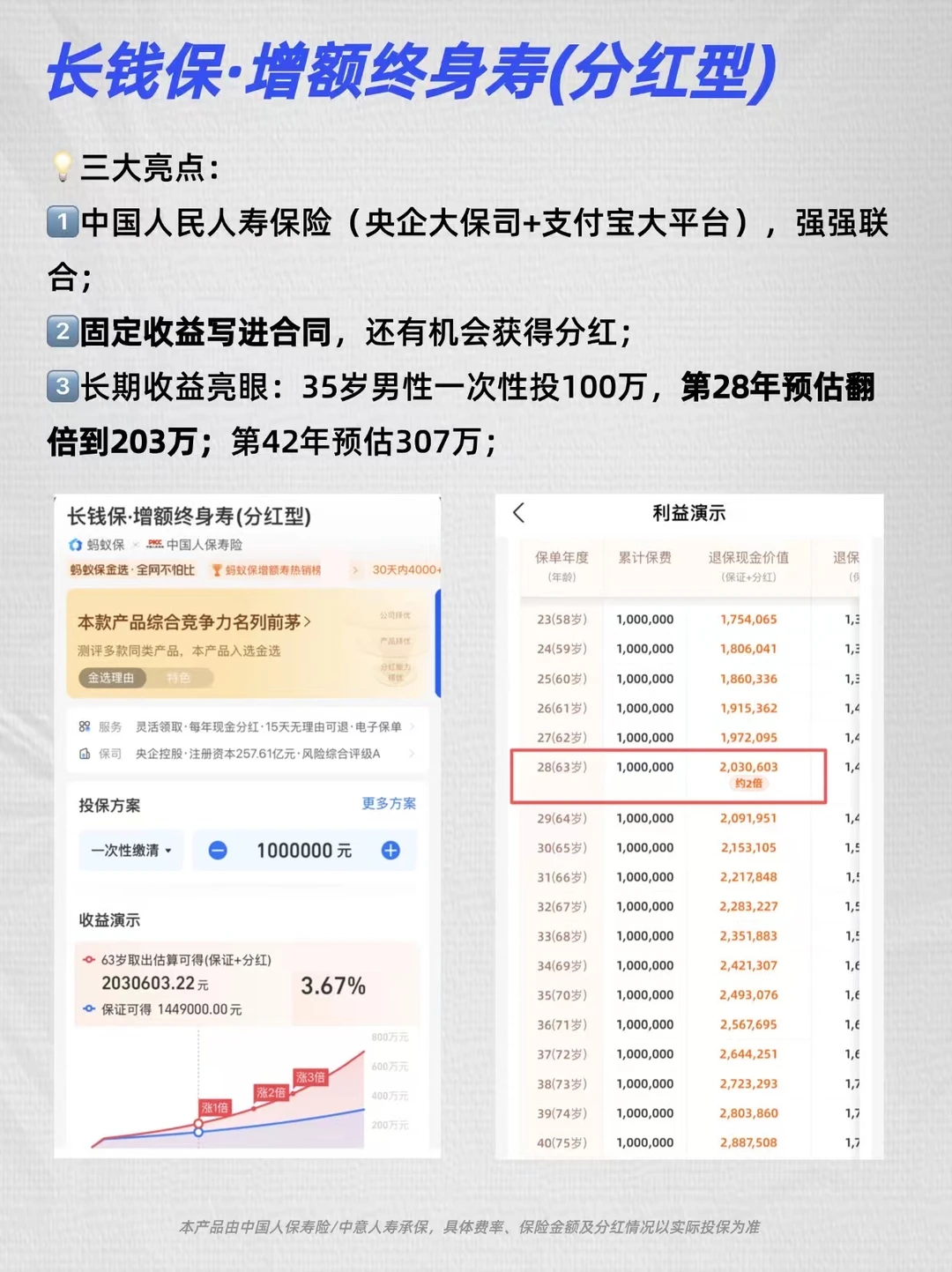 像支付宝上的长钱保·增额终身寿(分红型)就是不错的一款,它的核心卖点我总结成三句话: