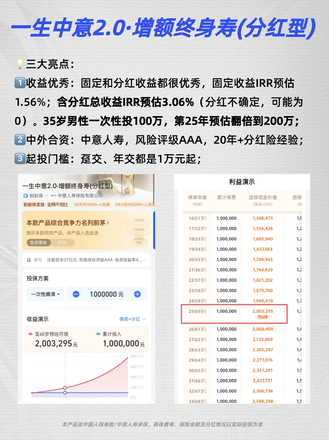 还有一款一生中意2.0·增额终身寿(分红型)也很优秀,这一款更像“想在扎实的基础上,再争取一点上行”的选择: