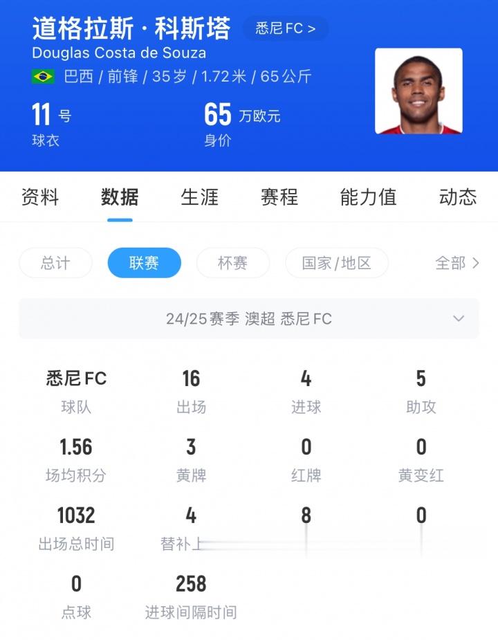 道格拉斯·科斯塔曾效力拜仁、尤文等俱乐部,上赛季为悉尼FC出战25场比赛,打进6球,助攻8次。