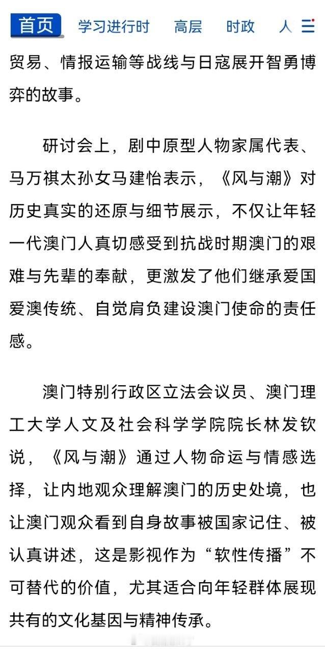 《风与潮》又被夸了新华社1/15就中国电视艺术委员会、广东省广播电视局14日在北京联合主办的《风与潮》研讨会发表文章:《澳门题材剧〈风与潮〉以影像凝聚民族情感〉与会者认为,该剧以影像的方式凝聚民族情感,弘扬爱国精神,强化文化认同,彰显了“一国两制”下澳门与内地血脉相连、文化相融的深厚情谊。这次研讨会的热烈反响,多家媒体发表文章,印证了《风与潮》的珍贵价值——它不仅是首部聚焦澳门抗战历史的剧作,更是为这座城市立传的匠心之作。由衷为《风与潮》喝彩,也为用心诠释何贤先生的任嘉伦喝彩!