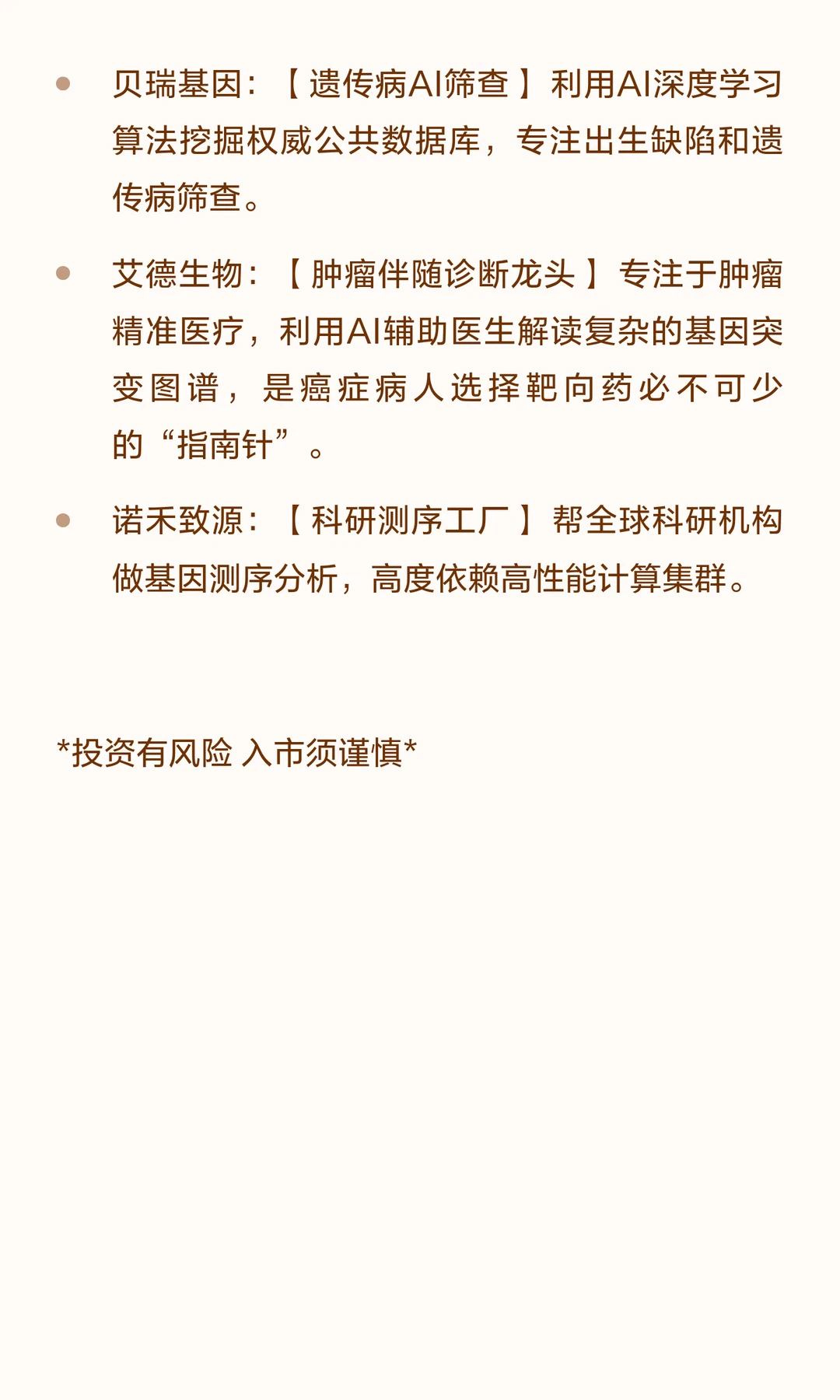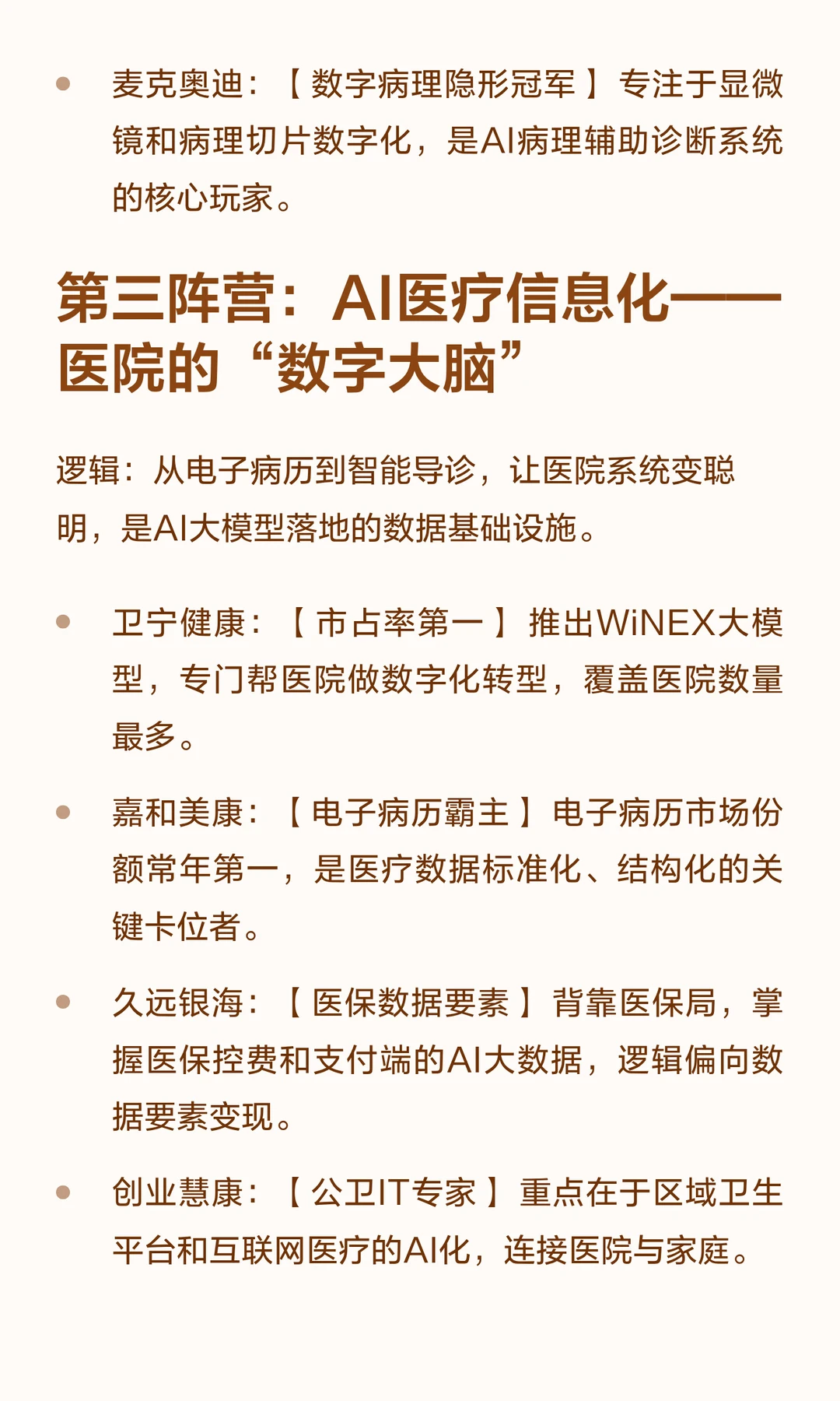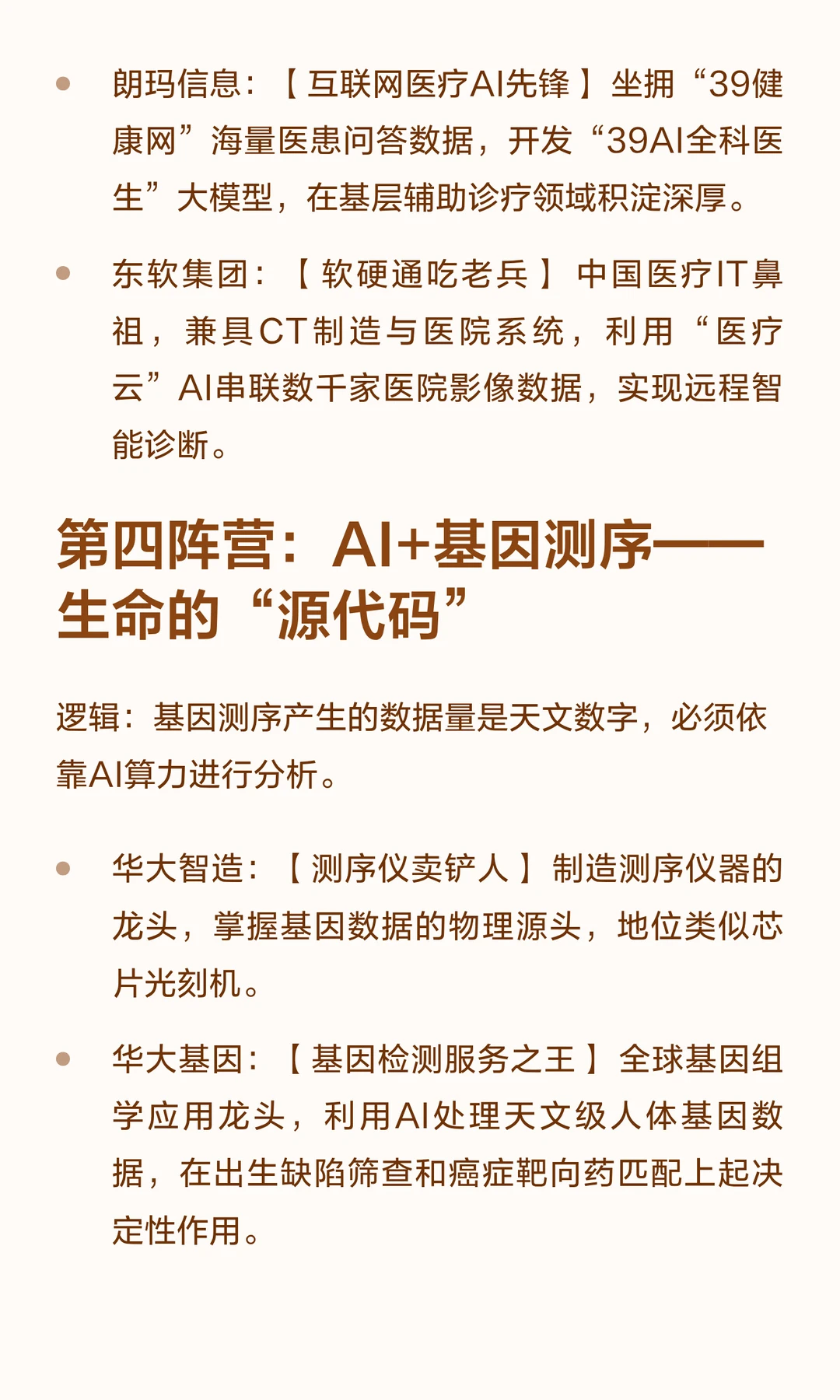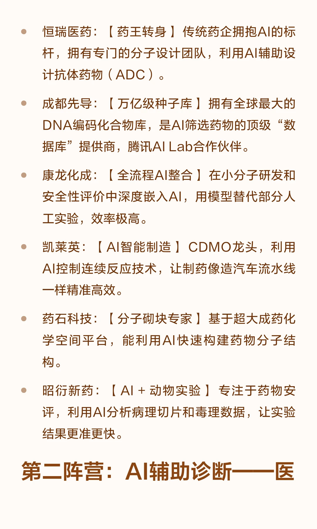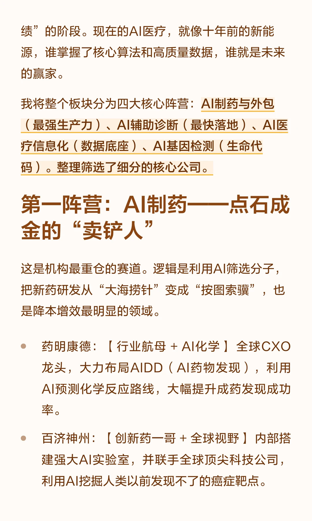 我将整个板块分为四大核心阵营:AI制药与外包(最强生产力)、AI辅助诊断(最快落地)、AI医疗信息化(数据底座)、AI基因检测(生命代码)。整理筛选了细分的核心公司。