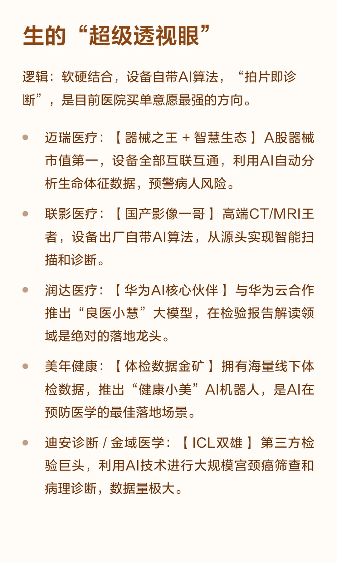 关键数据不会骗人:AI介入后,新药研发周期有望缩短40%以上,成本降低甚至过半;在影像诊断上,AI的效率能提升50%,准确率更是直逼主任医师。对于中国来说,随着人口老龄化加剧和数据要素政策落地,AI医疗已经从“讲故事”进入了“拼业绩”的阶段。现在的AI医疗,就像十年前的新能源,谁掌握了核心算法和高质量数据,谁就是未来的赢家。