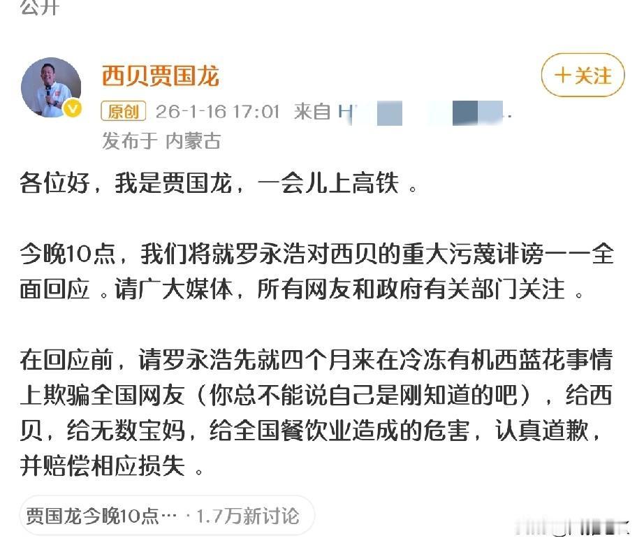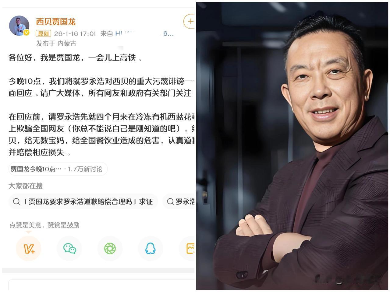 罗永浩 麻烦大了,贾老板宣布要放大招: 今晚10点要就罗永浩对西贝的重大污蔑诽谤