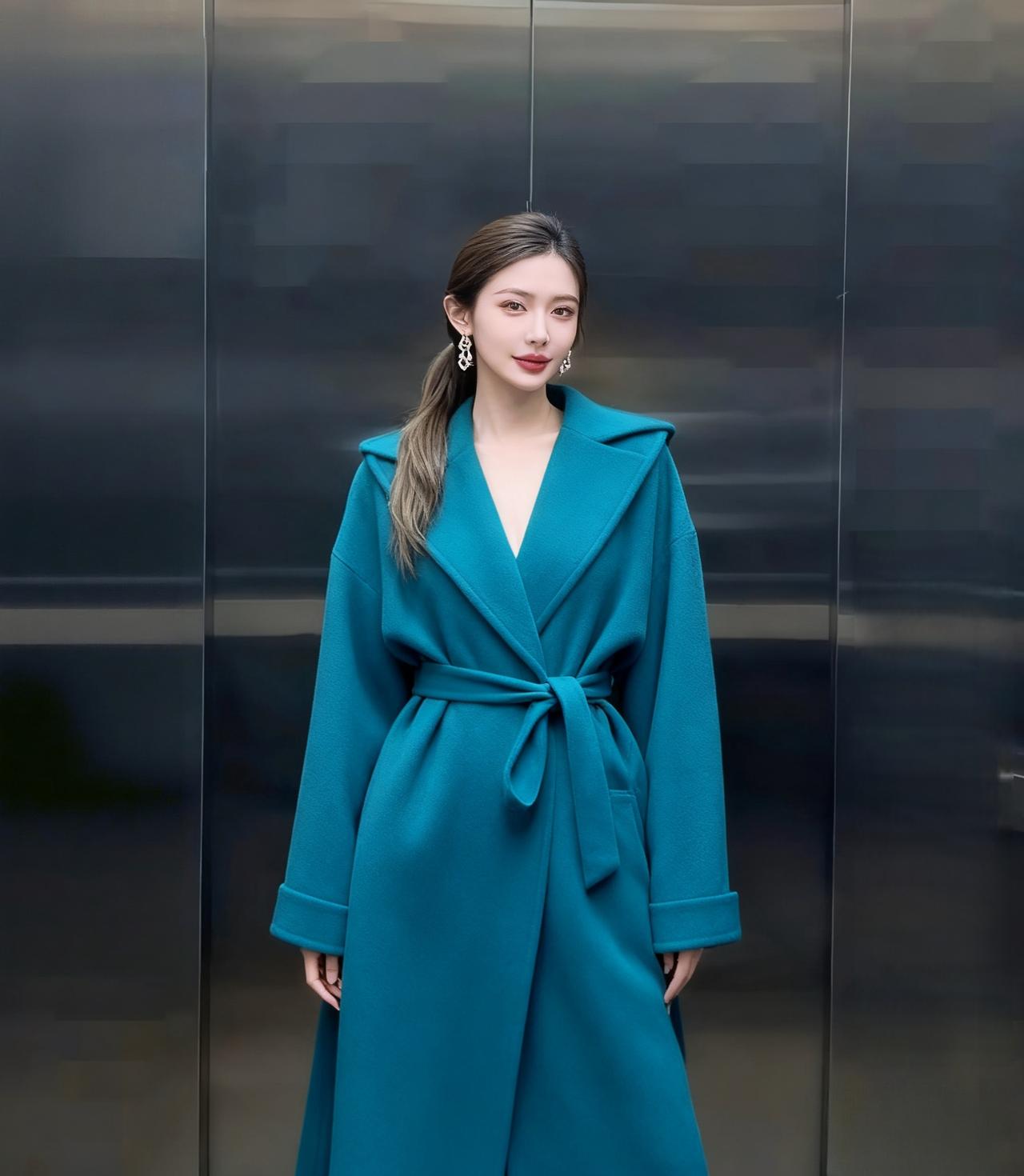 孔雀蓝浴袍式大衣,V领设计自带性感张力,腰间同色系腰带精准收束腰线,既勾勒出身材