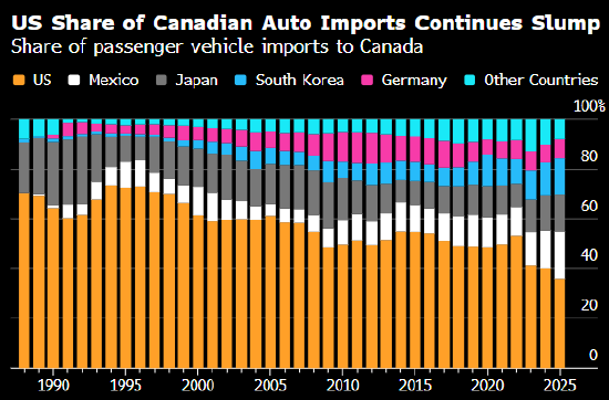 根据加拿大统计局的进口数据,2025年前10个月,加拿大进口的乘用车中只有36%是在美国制造的。相比之下,此前10年的平均占比为49%。