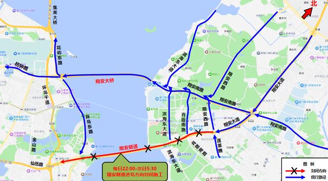 “第一级是远端的告知提醒,从沈海高速下来后,在翔安大道及辖区的主干道上,设置翔安隧道施工提示牌;第二级是交通绕行路口,在海翔大道、翔安南路、西滨立交等路段设置绕行提示牌;第三级提示牌设置在翔安大道与翔安西路的交通管控点,全方位提醒市民注意绕行。”交警部门介绍。